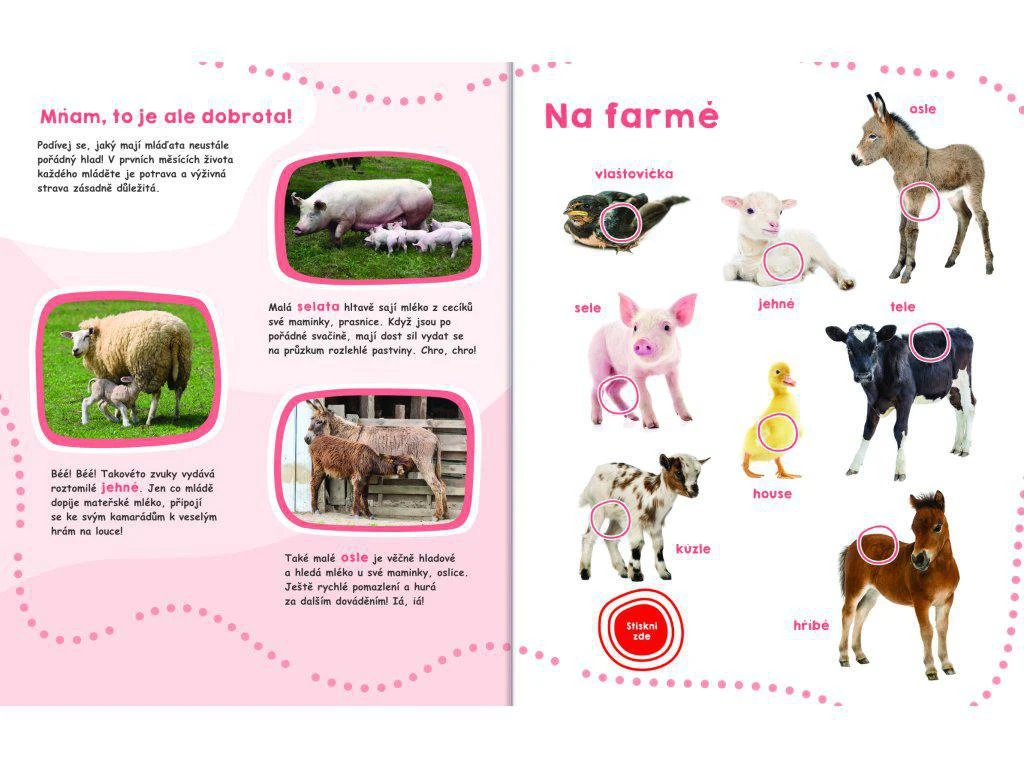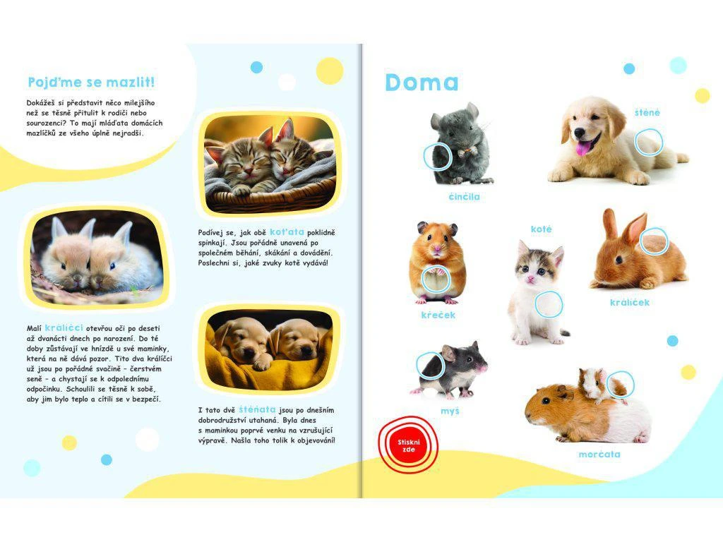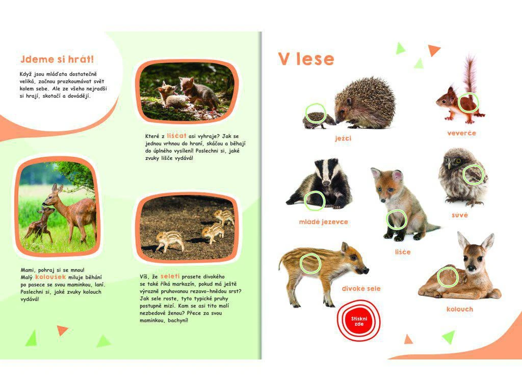 Objevuj zvířata z celého světa a jejich mláďata! Stačí aktivovat příslušnou stránku pomocí červeného tlačítka a užít si zvuky nejrůznějších zvířat. Jaký zvuk vydává kotě? Jak dělá house? A jak medvídě? V této knize stisknutím tlačítka ožije 43 zvířat z různých prostředí světa. Na 7 tematických stránkách se potkala zvířata a mláďata ze všech koutů planety - z farmy přes hory až po oceán. Objevujte s vašimi nejmenšími úžasnou zvířecí říši! Kvalitní fotografie, realistické zvuky zvířat a první fakta nabízejí těm nejmenším milovníkům přírody a objevitelům fauny spoustu zábavy!