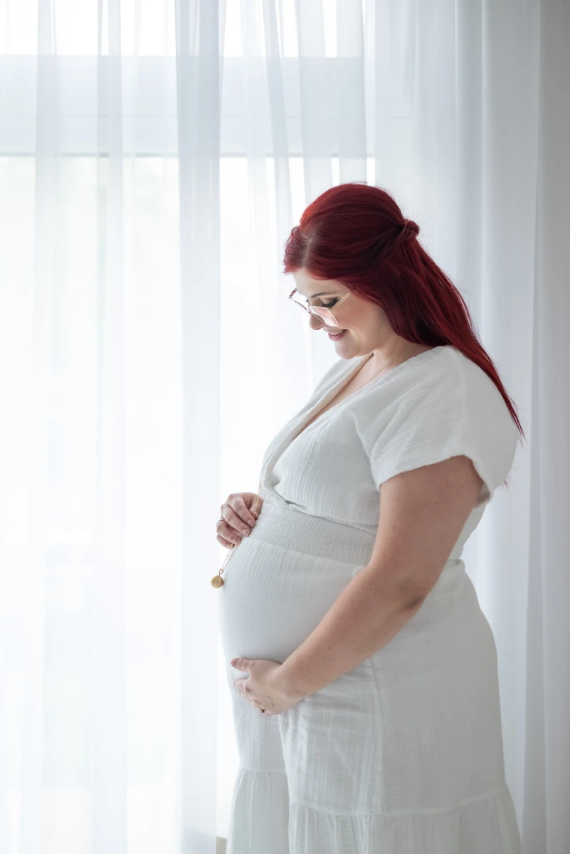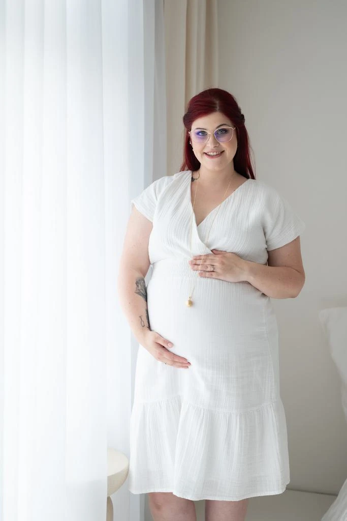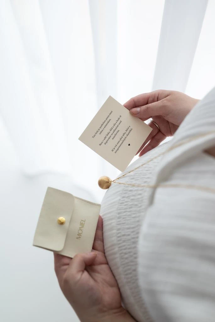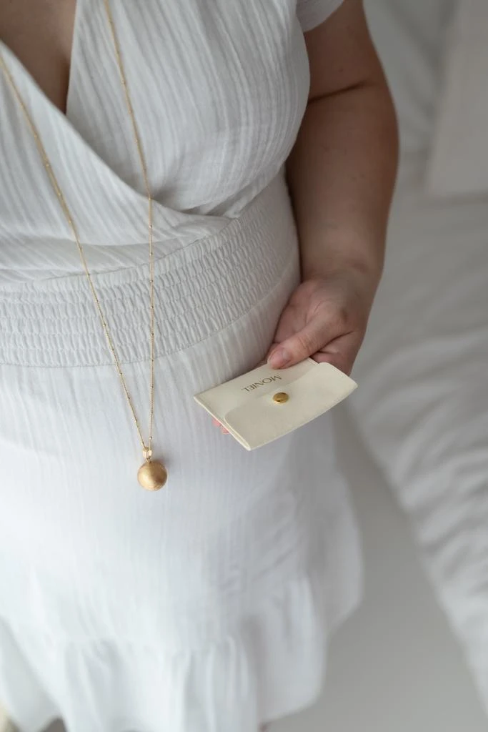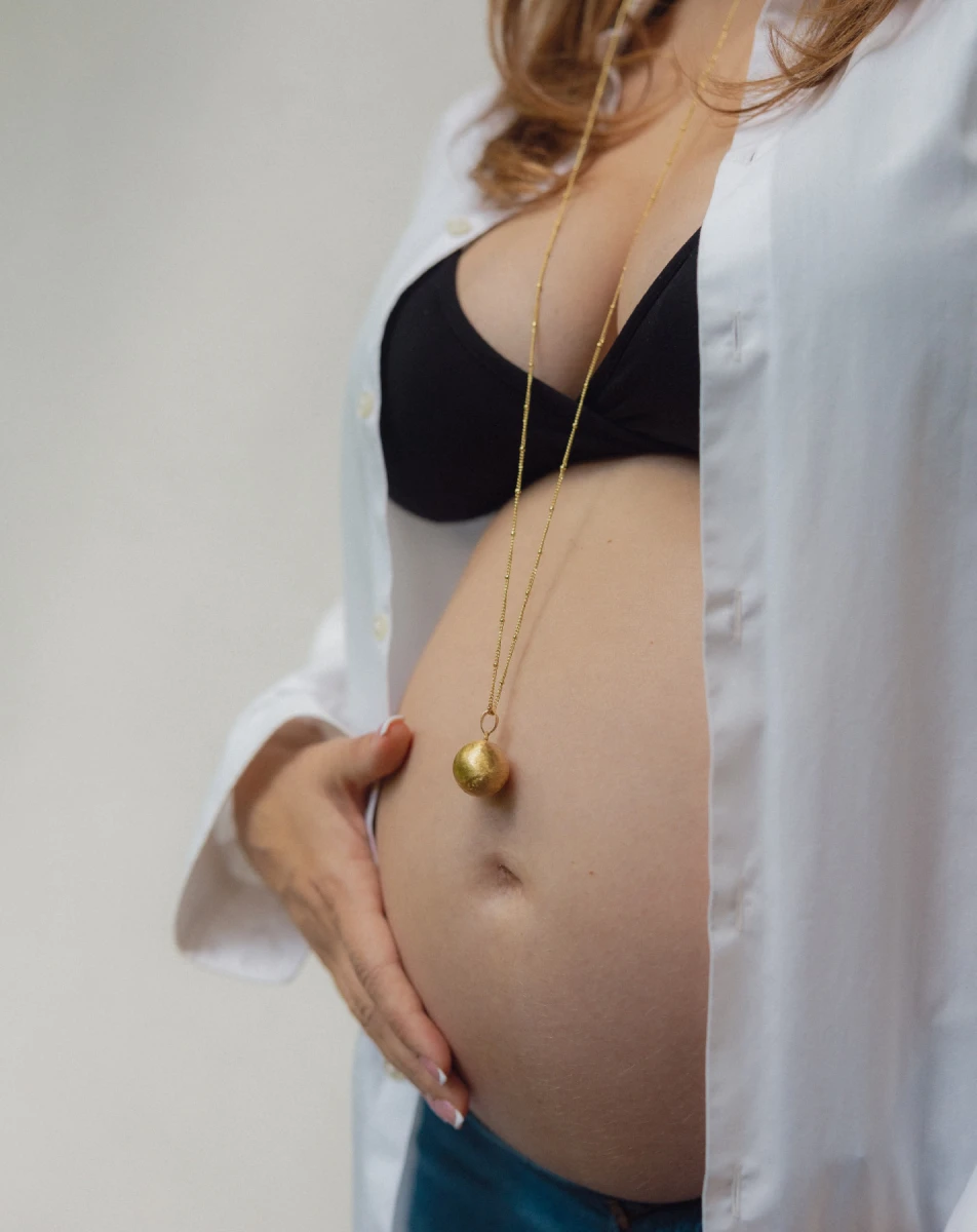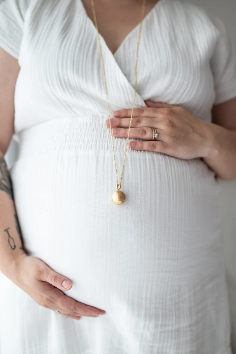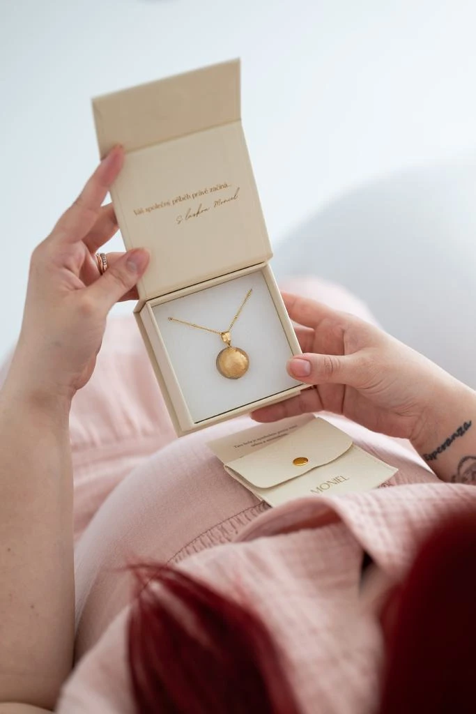 Těhotenský šperk bola Glow hladká zlatá s bílým kamínkem + řetízek Moniel