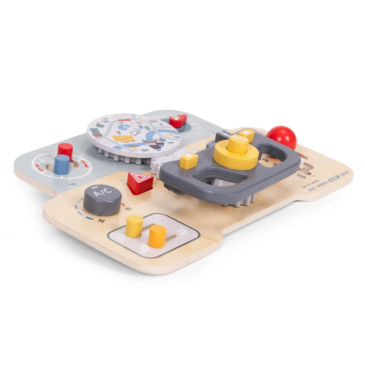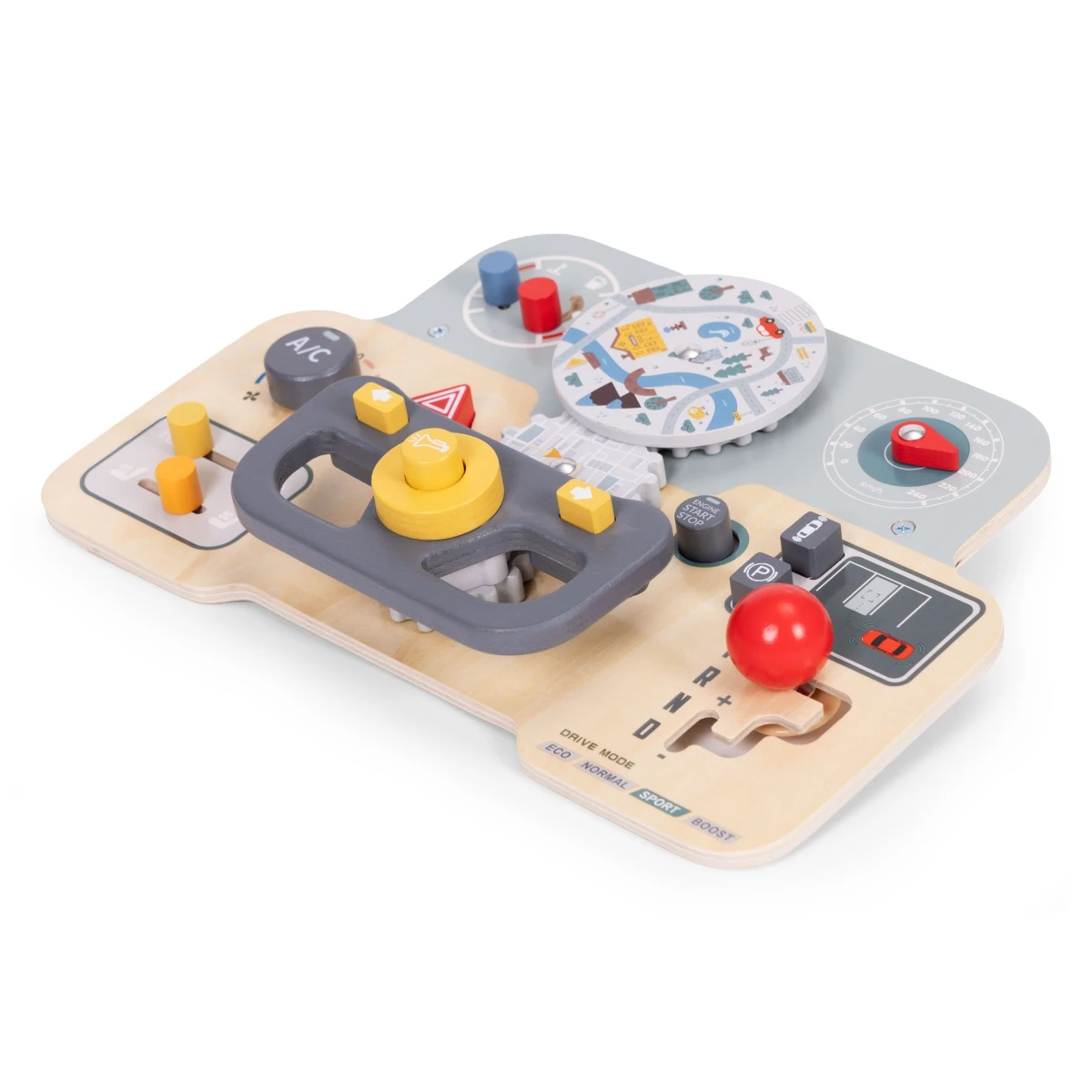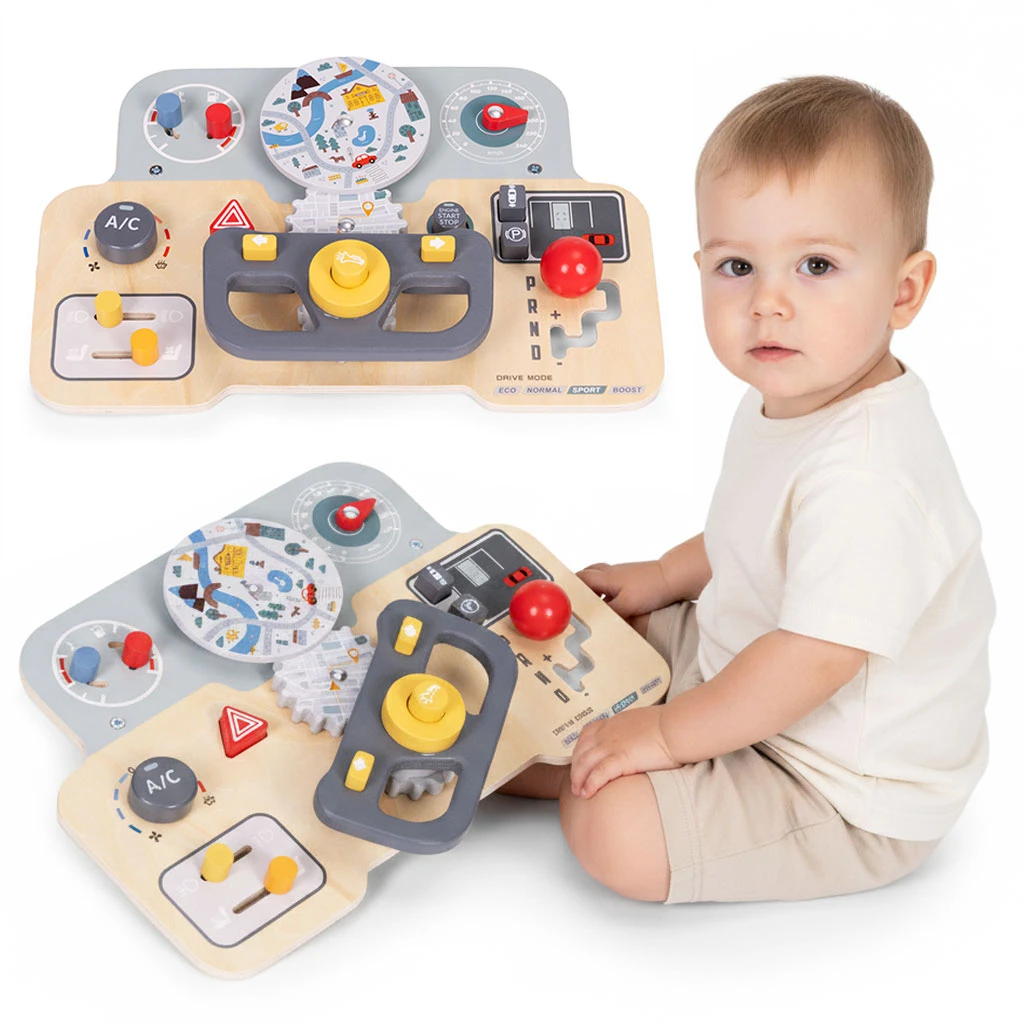 Montessori manipulační deska pro děti – dřevěný panel s volantem a přepínači
