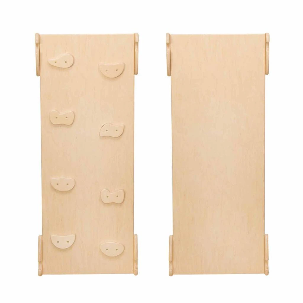 Dvoustranný design nabízí různé možnosti pro lezení a hraní – jedna strana má hladký povrch pro skluzování nebo lezení, zatímco druhá strana má dřevěné lišty pro lezení.