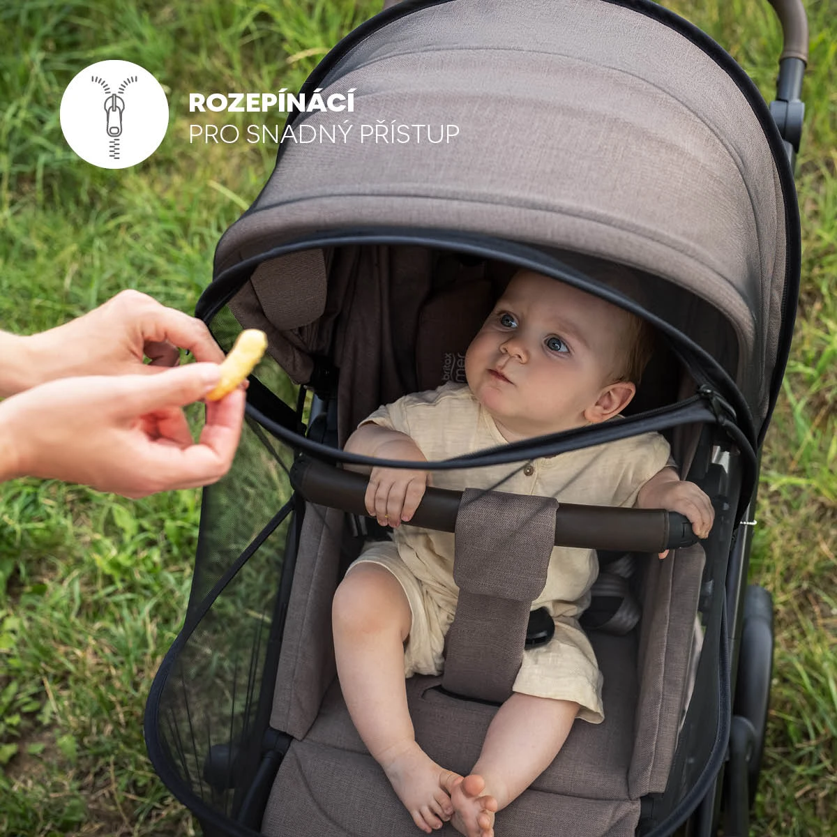 Spolehlivá ochrana proti hmyzu – pasuje na sportovní sezení i hlubokou korbu. Praktické zipové okénko umožňuje rychlý přístup k dítěti bez nutnosti sundání celé moskytiéry.