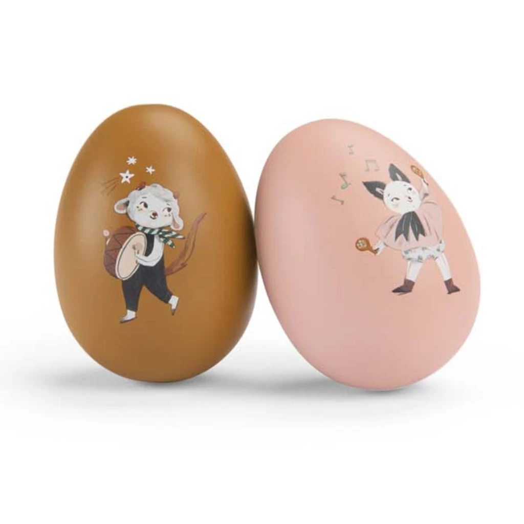 Tyto roztomilé maracas z dřevěných vajíček v jemných růžových a taupe odstínech jsou zdobeny krásnými, poetickými ilustracemi z kolekce Apres la pluie, kterou navrhla Lucille Michieli. Díky ergonomické velikosti, navržené speciálně pro malé dětské ruce, jsou ideální pro první hudební experimenty vašich nejmenších.