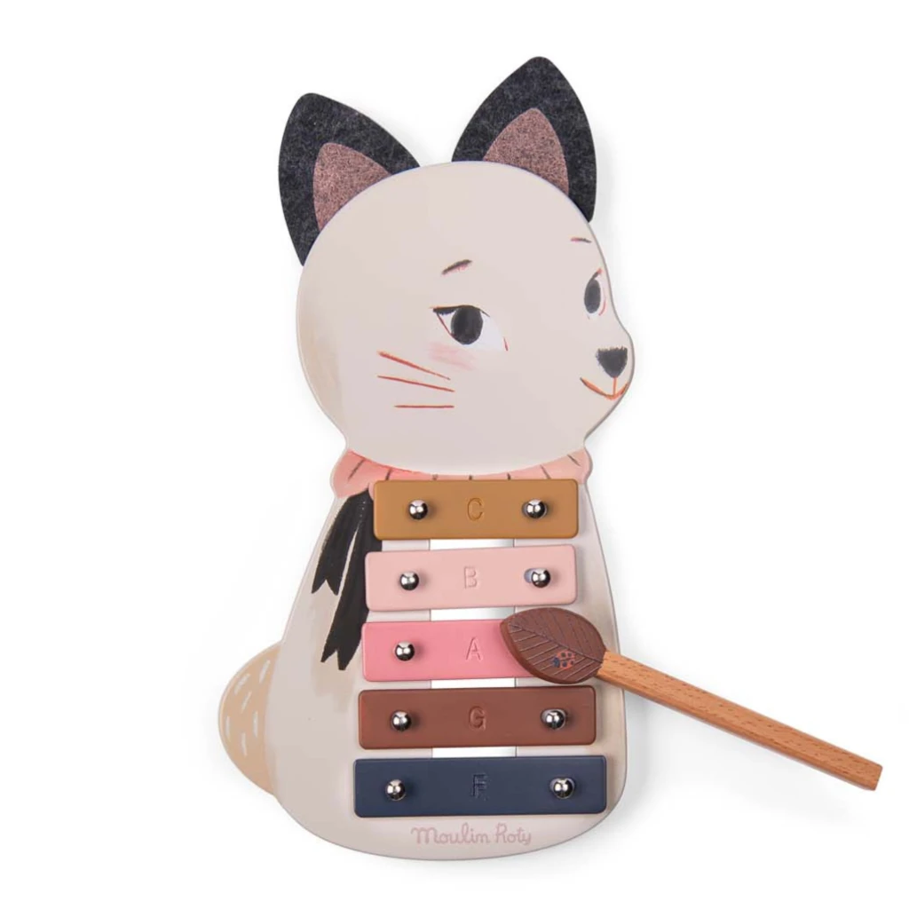 Dřevěný podstavec se zaoblenými tvary je ozdoben ilustrací Plume z kolekce Po dešti a doplněn o dvě plstěné ouška. Hra na metalofon pomáhá rozvíjet rytmus, motoriku a hudební vnímání u nejmenších dětí.