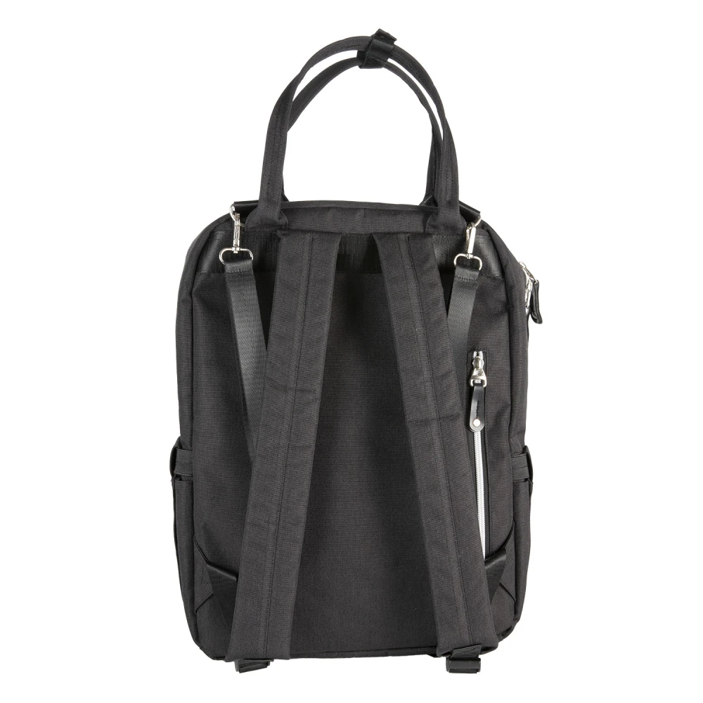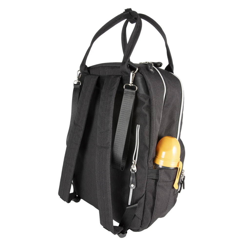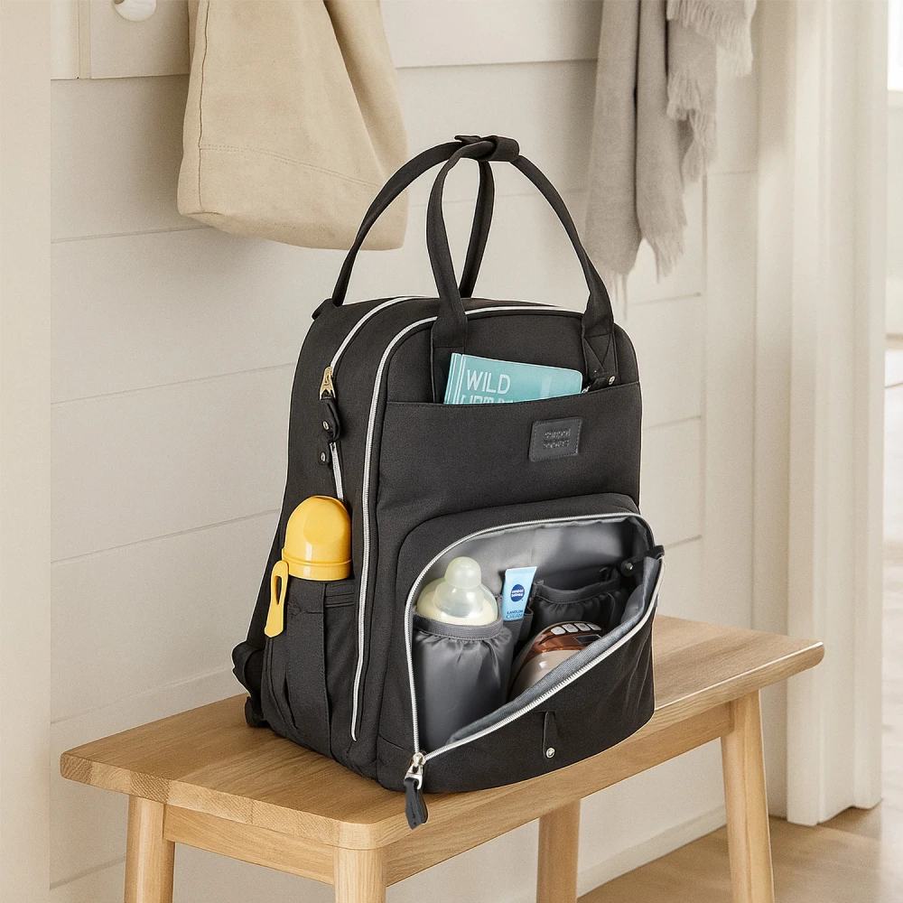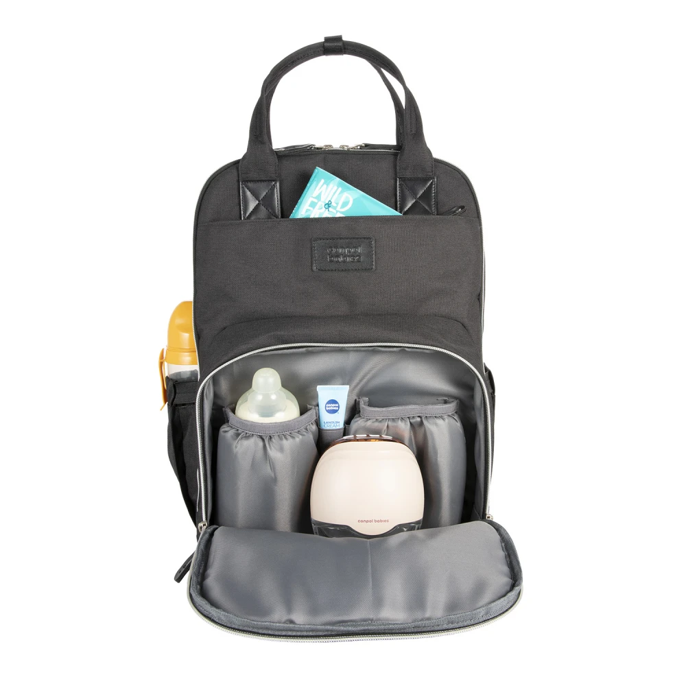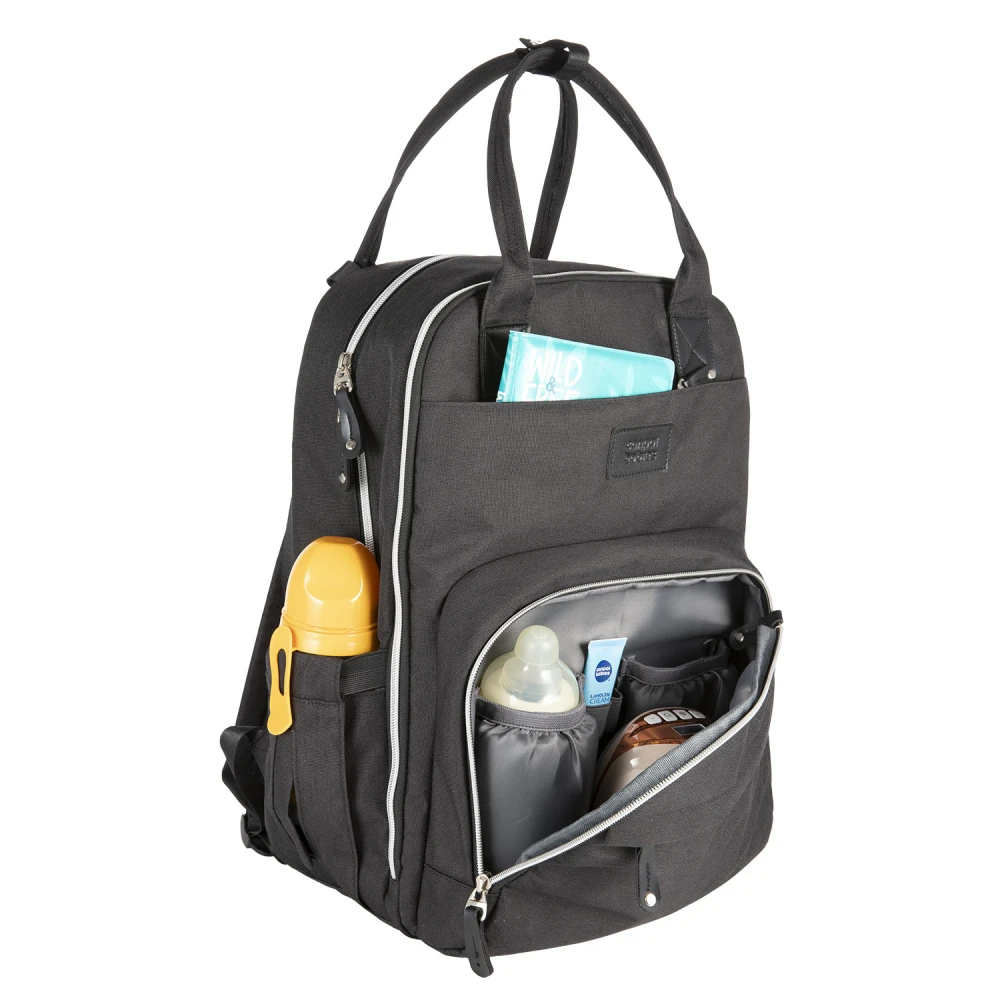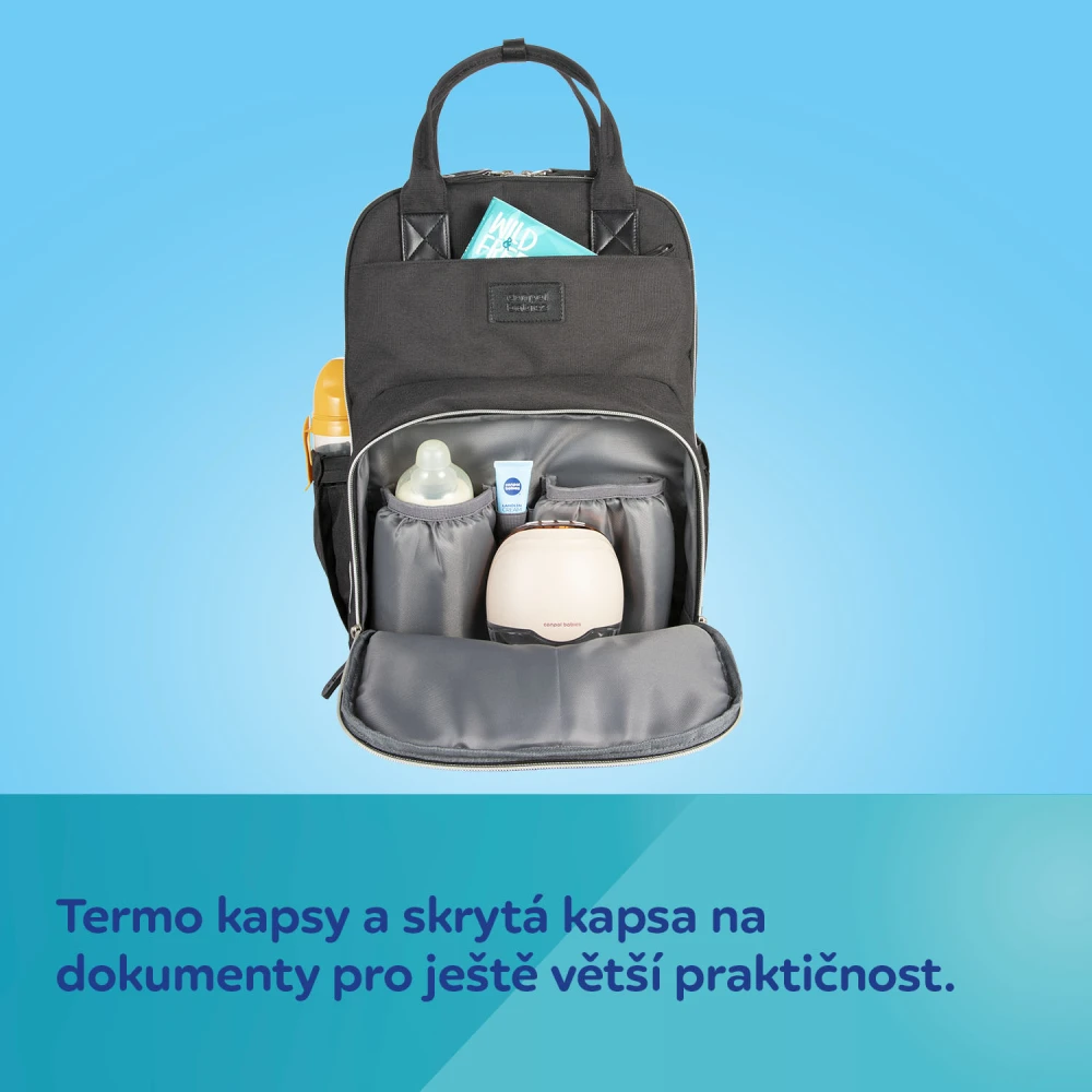 Dvě praktické boční kapsy - jedna přímo určená pro navlhčené ubrousky s manipulačním otvorem, druhá na hrnek či lahev – kapsy umožňují snadný přístup bez nutnosti otevírání hlavní kapsy.