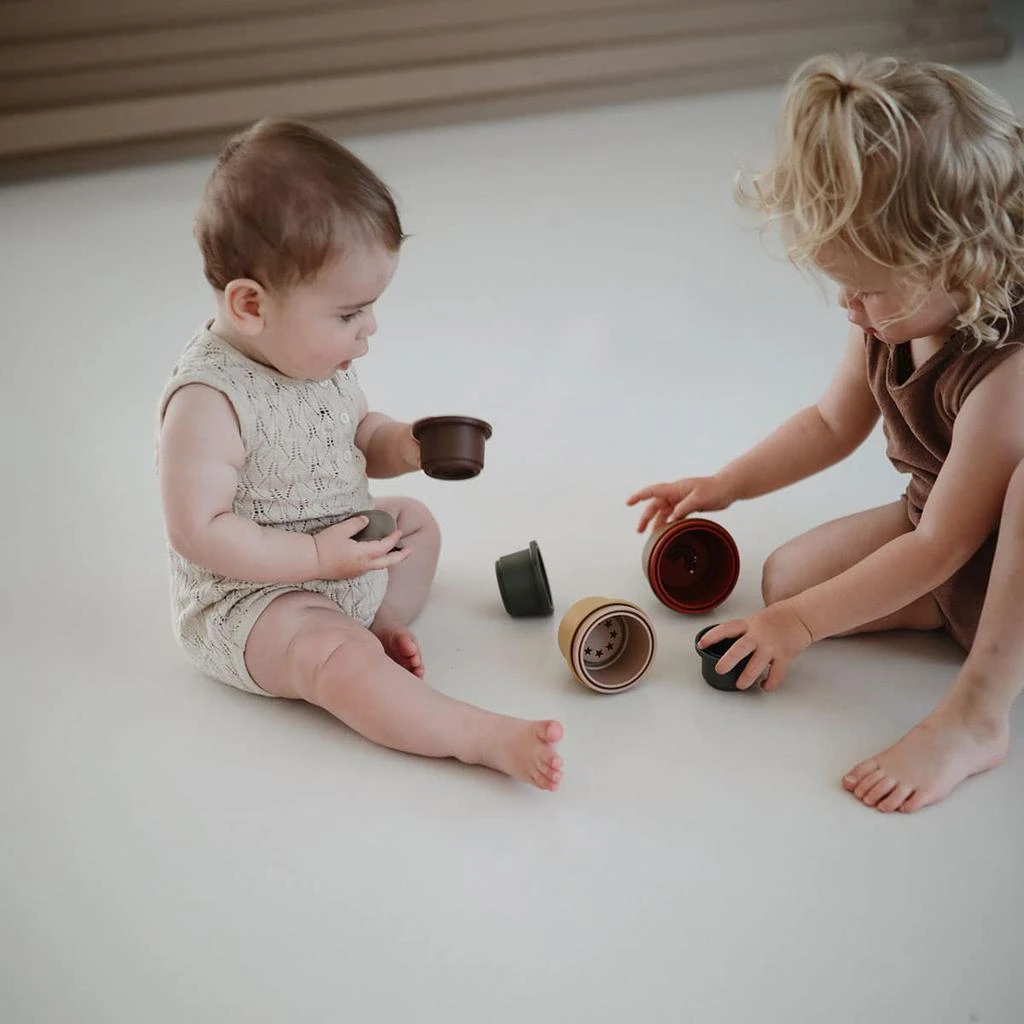 Při hře se skládacími skleničkami se fantazii meze nekladou. Dají se použít také jako formičky do písku nebo hračka do vody díky různým otvorům pro přetékání vody.