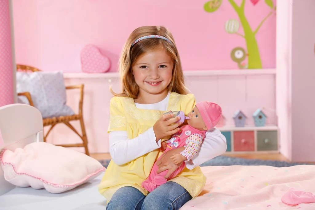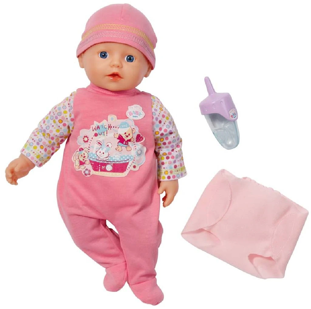 Balení obsahuje: panenku v dupačkách a v čepičce, lahvičku a textilní plenku.