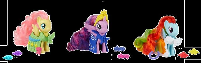 V nabídce jsou 3 postavičky poníků, každý s 2 doplňky do vlasů a vlastním jedinečným oblečkem: FLUTTERSHY, RAINBOW DASH a TWILIGHT SPARKLE - dodáváme dle aktuálního stavu skladových zásob.