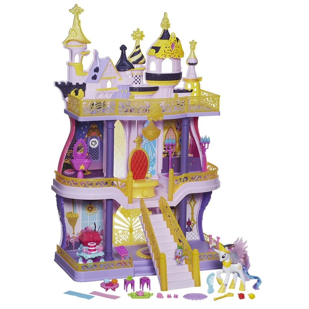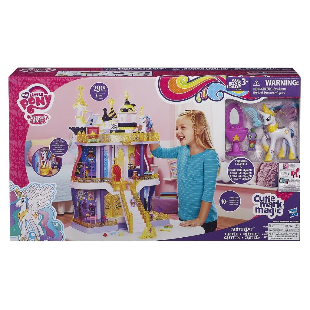 Přátelství a zábava z Canterlot přichází k vám! Obrovský zábavný hrací set, hrad Canterlot, má 3 patra s různými pokoji a výtahem (ložnice, koupelna, salónek, knihovna, balkón a trůní sál). Je tu dost místa pro vaše oblíbené poníky, tak roztočte zábavu v sálech vašeho hradu Canterlot! Obsahuje 2 postavičky - Princezna Celestia s exkluzivními dekoracemi a její kamarád Spike (Spike k dostání pouze v této sadě). Naskenujte kód do aplikace a objevte úžasnou zábavu v online hře My Littly Pony. 1 kód má princezna Celestia a 6 dalších najdete v každé místnosti hradu.