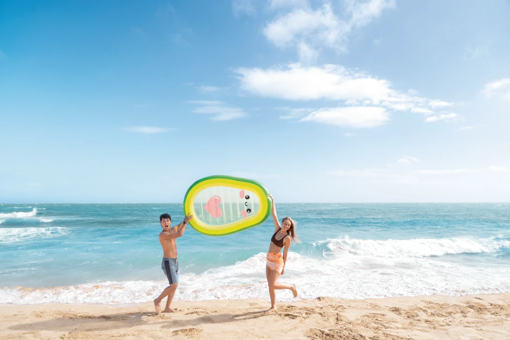 Nafukovací lehátko ve tvaru avokáda Avocado Buddy je originální letní doplněk určený pro relaxaci na vodní hladině. Jeho tvar je věrně inspirován avokádem, přičemž vnější okraj je tmavě zelený, přecházející do světlejší zelené a žluté barvy směrem k centru. Střed lehátka je průhledný a vybavený kreslenou tvářičkou s roztomilými očima, růžovými tvářemi a úsměvem, což dodává produktu hravý a přátelský vzhled. Na průhledné ploše je také výrazné růžové srdce, které přispívá k jeho estetické přitažlivosti.