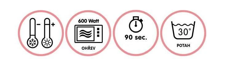 - ohřívá se v mikrovlnné troubě (90 sekund při 600W - pouze výplň v bílém sáčku, nikoliv potah)