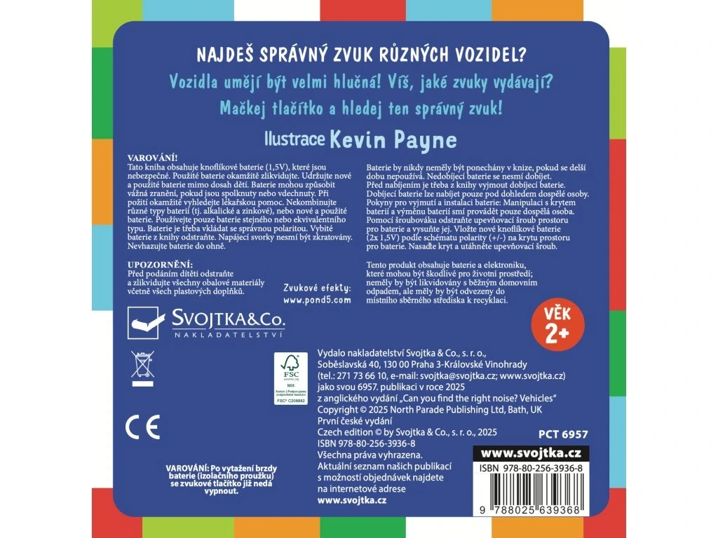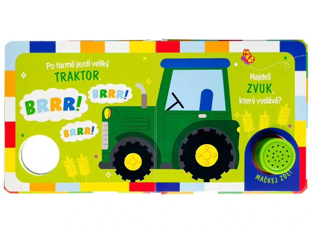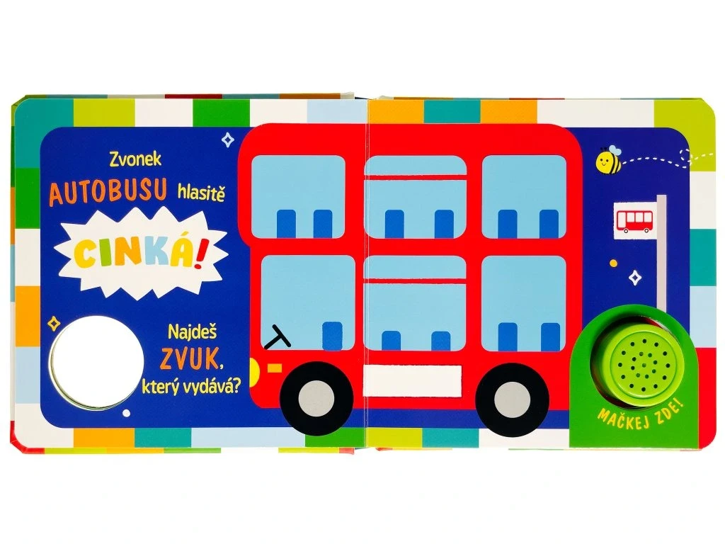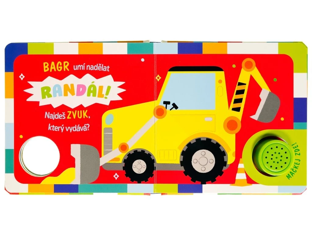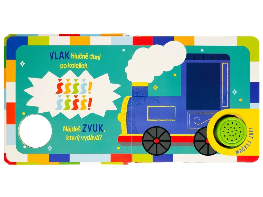 V této vesele ilustrované knize budeš hledat konkrétní zvuk dopravního prostředku. Poznáš například vlak? A víš, který zvuk vydává? Bagr umí nadělat pořádný randál, sporťák uhání rychlostí blesku. A jak dělá třeba traktor? Mačkej tlačítko tak dlouho, dokud správný zvuk nenajdeš! Po vytažení brzdy baterie (izolačního proužku) se zvukové tlačítko již nedá vypnout. Zvuky tedy hrají vždy, když se tlačítko zmáčkne. Tato zábavná kniha s vozidly malé děti jistě poučí, ale rozhodně zabaví.