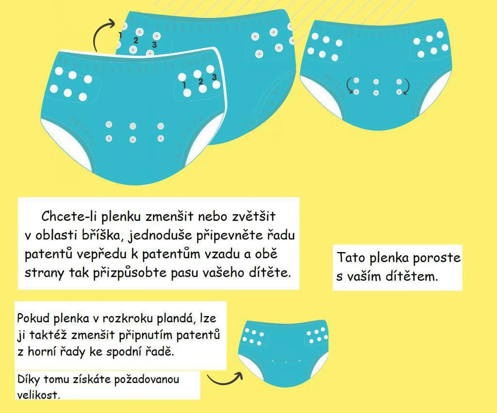 Díky drukům můžete jednoduše nastavit požadovanou velikost. Tato plenka poroste s vaším dítětem. Nastavitelná plenka je navržena jakou součást systému Happy Nappy pro další a větší ochranu proti únikům do bazénu. Lze ji nosit samostatně také jako alternativa jednorázových plaveckých plen