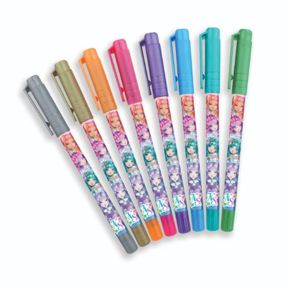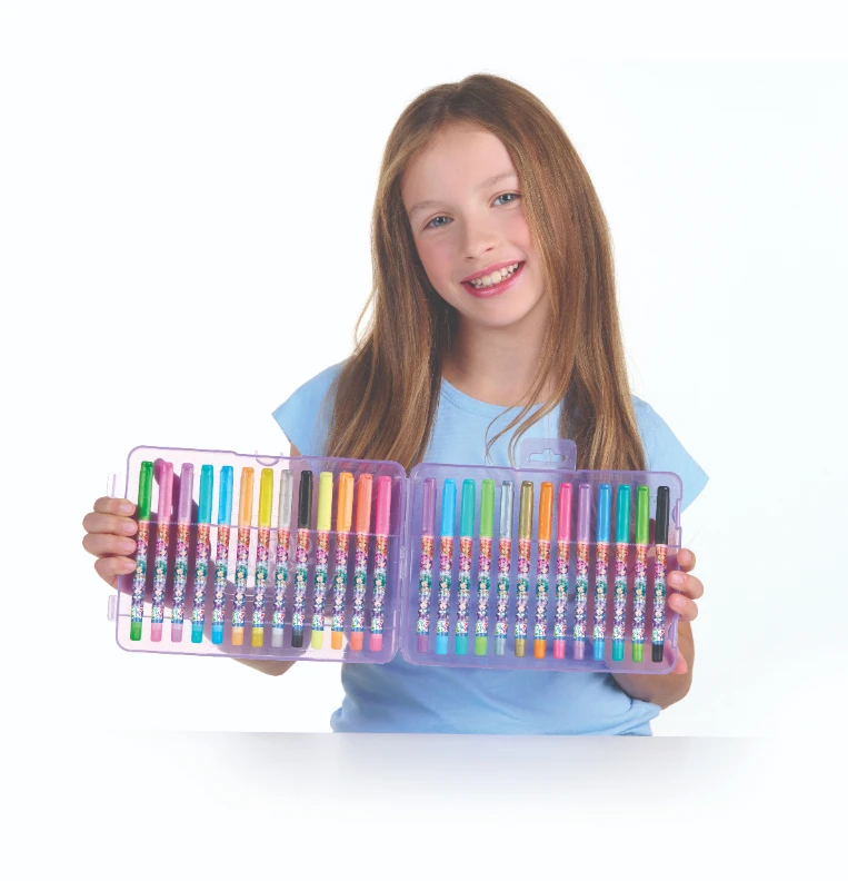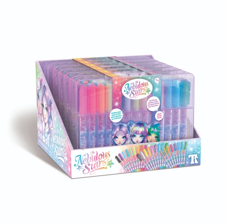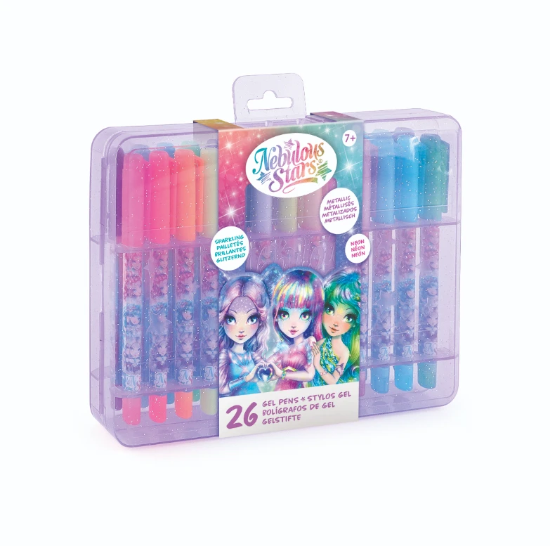 Plastový kufřík, který obsahuje 26 gelových per. Třpytivé neonové barvy, 9 per s třpytivým gelem, 8 metalických per, 8 neonových per, 1 černé gelové pero.