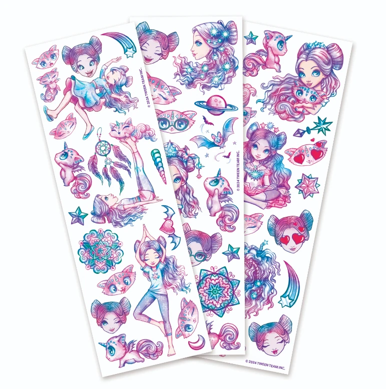 Jedno balení obsahuje 50 tetování, 3 archy 21,5 x 7,5 cm. Navlhčovací, dočasné tetování. Obsahuje CZ návod.