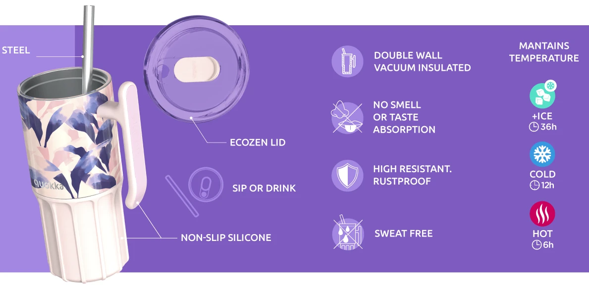 Quokka je značka zaměřená na výrobu moderních a stylových lahví na vodu, termosek a jídelních boxů. Značka je známá svým důrazem na design, funkčnost a ekologické materiály. Produkty Quokka jsou navrženy tak, aby byly nejen praktické, ale také esteticky atraktivní, což je činí oblíbenými mezi lidmi, kteří dbají na styl a udržitelnost. Quokka se zaměřuje na lidi s aktivním životním stylem a nabízí praktická řešení pro hydrataci doma, v kanceláři, ve škole nebo na cestách.