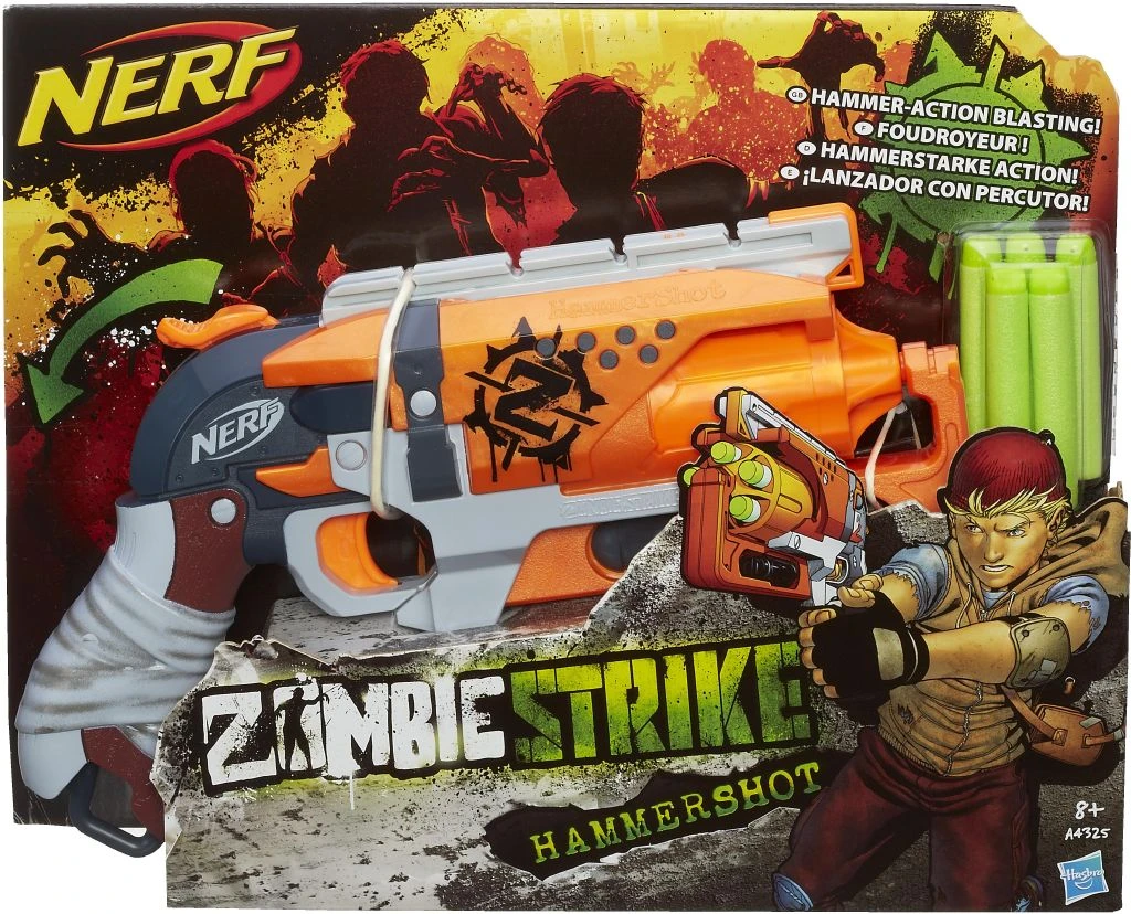 Balení obsahuje pistoli Zombie Strike Hammer Shot, 5 Zombie Strike šipek, Zombie Strike šablony.