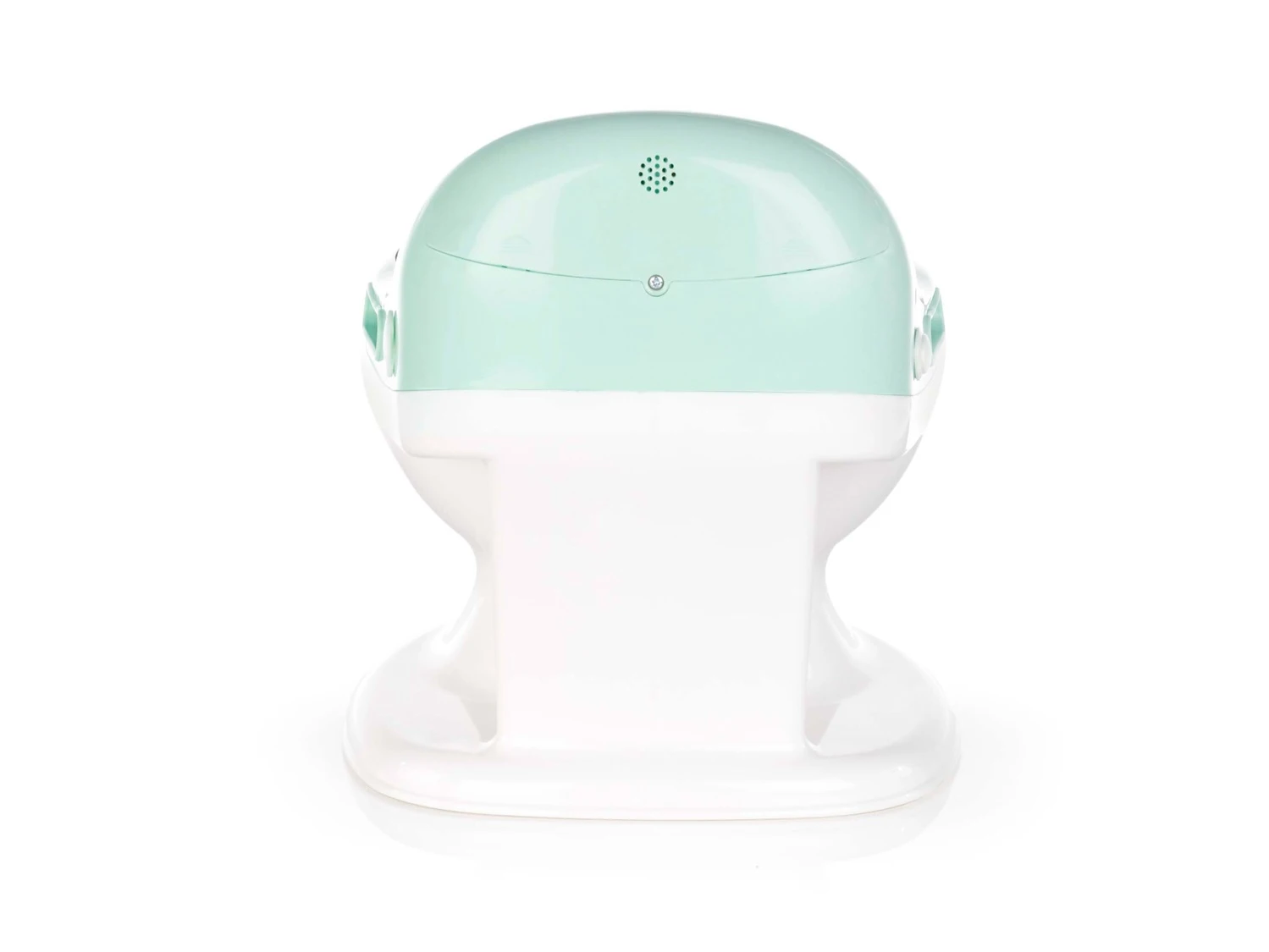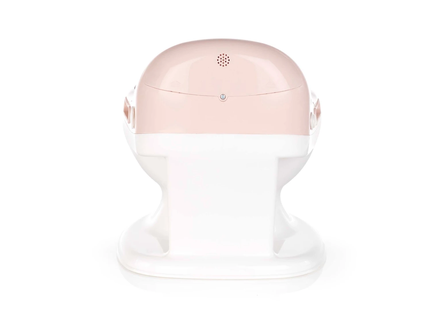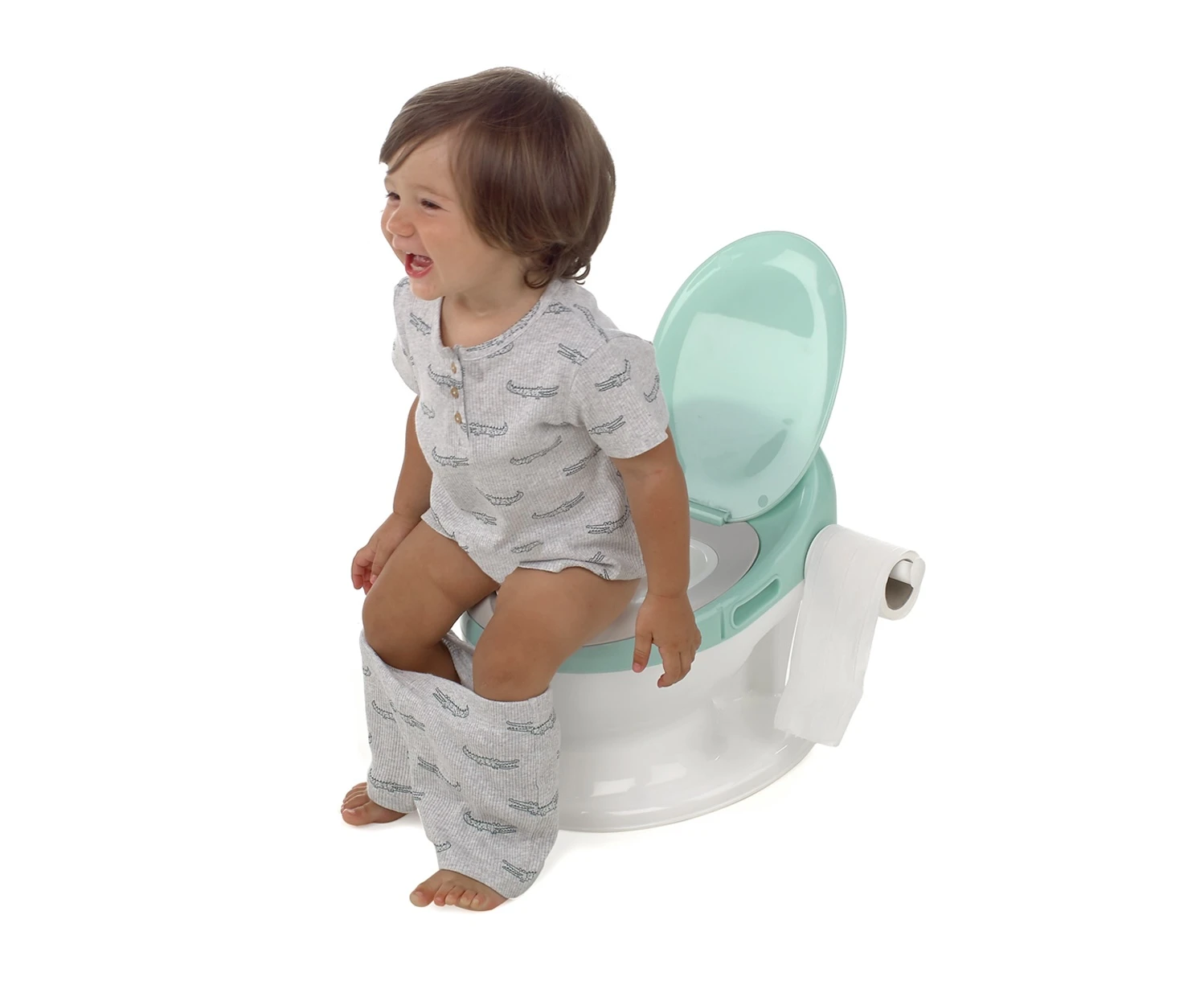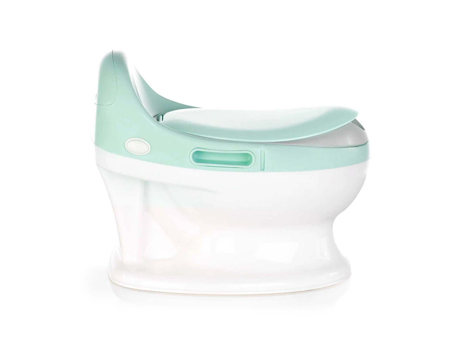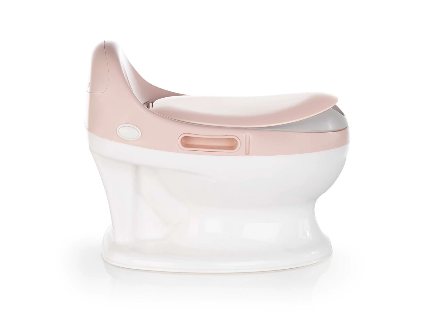 Po použití může dítě stisknout tlačítko a uslyší spláchnutí, což z učení dělá zábavnější a přirozenější zážitek. Pro stabilitu slouží protiskluzové pásky na spodní části, hygienu usnadňuje odnímatelná nádoba a ochrana proti vystříknutí tekutiny. Sedátko je vyrobené z hladké gumy pro příjemné sezení.
