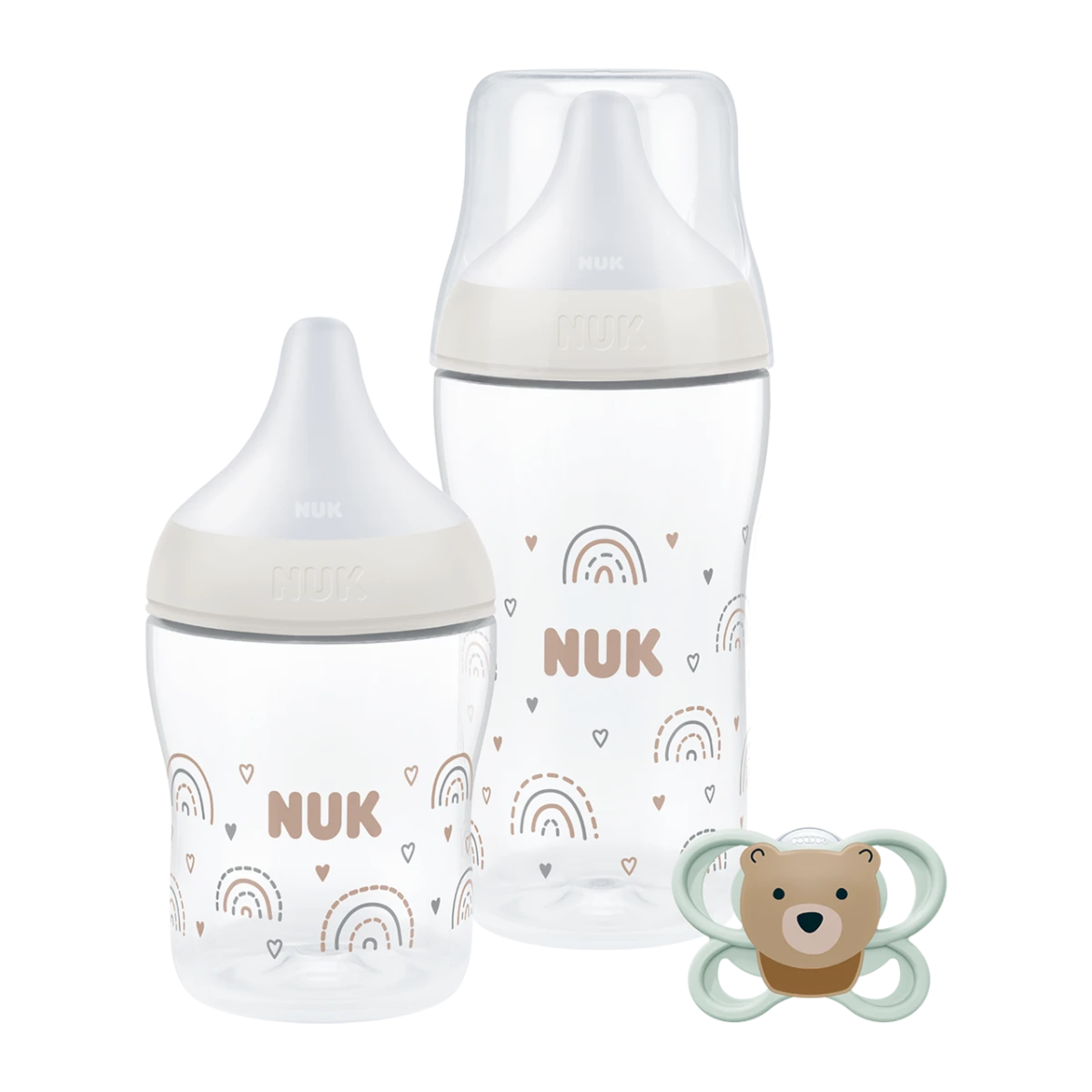 - 2× kojenecká láhev NUK Perfect Match s patentovaným indikátorem kontroly teploty, jedna láhev o objemu 150 ml ve velikosti S (od 0 měsíců pro mateřské mléko), jedna láhve o objemu 260 ml ve velikosti M (od 3 měsíců pro umělé kojenecké mléko)