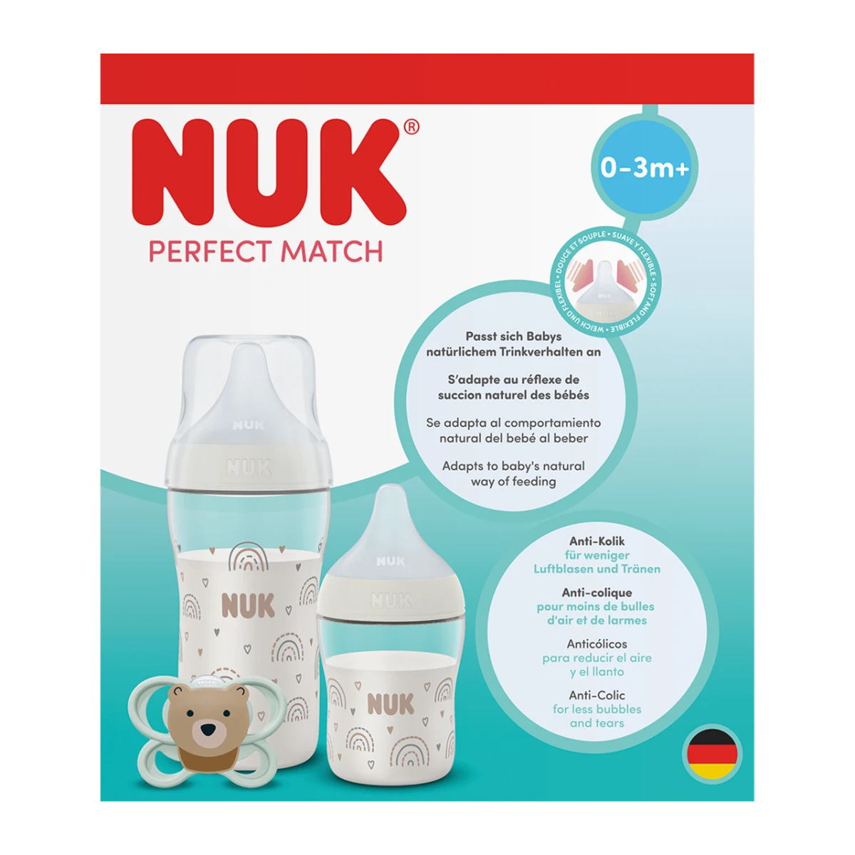 - Osvědčený antikolikový systém NUK snižuje množství vzduchu, které miminko během krmení spolyká. Méně bublinek znamená méně bolení bříška, méně plynatosti a klidnější krmení – ideální pro novorozence a kojence citlivé na podráždění bříška.