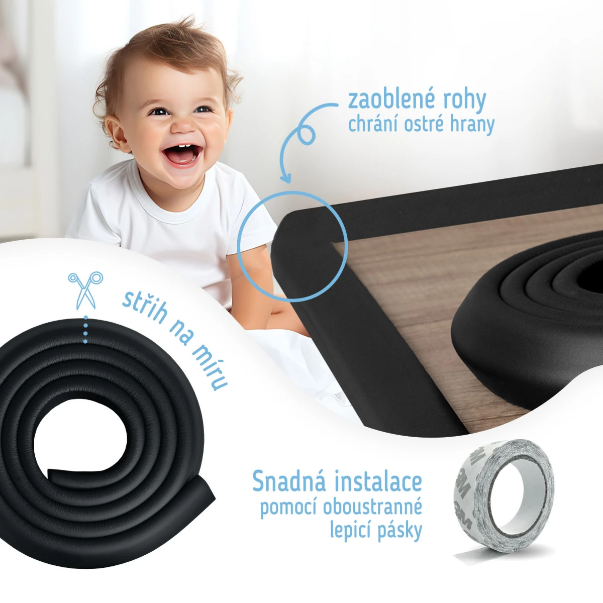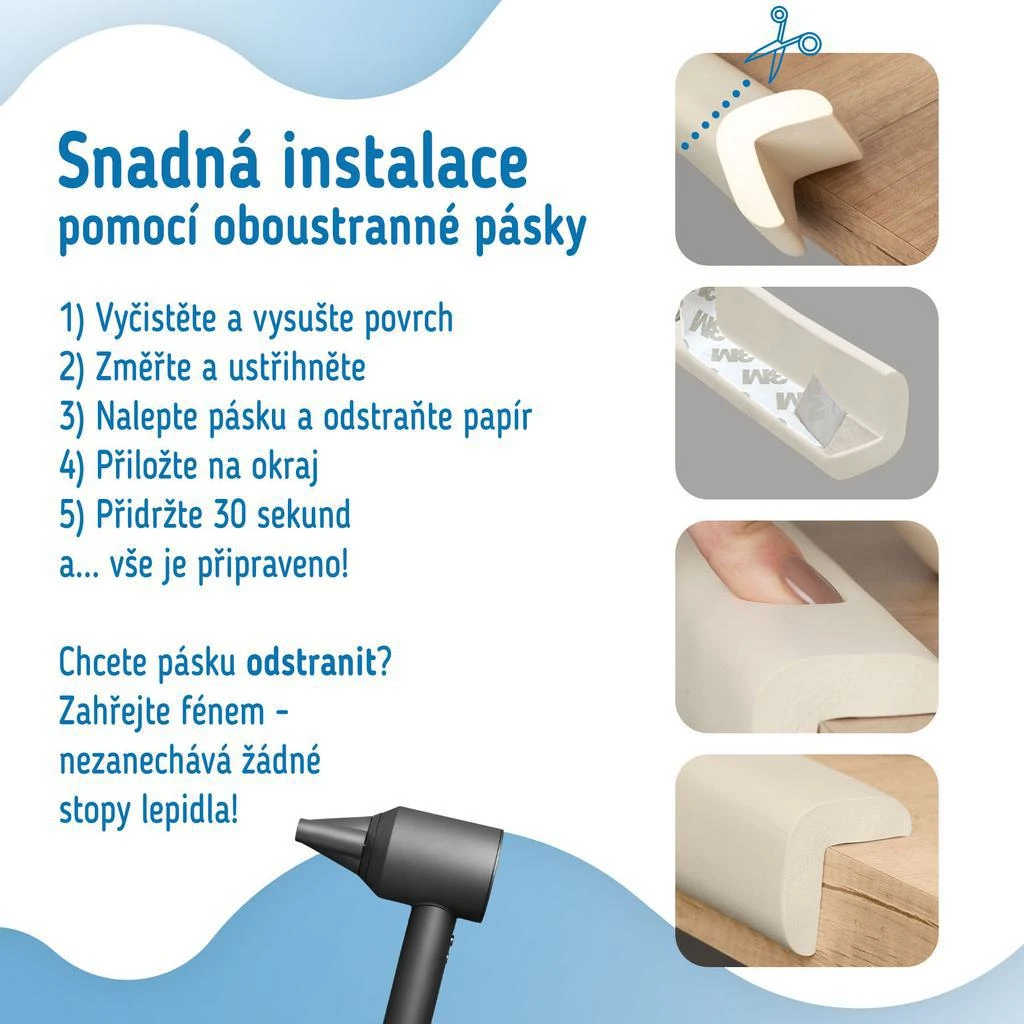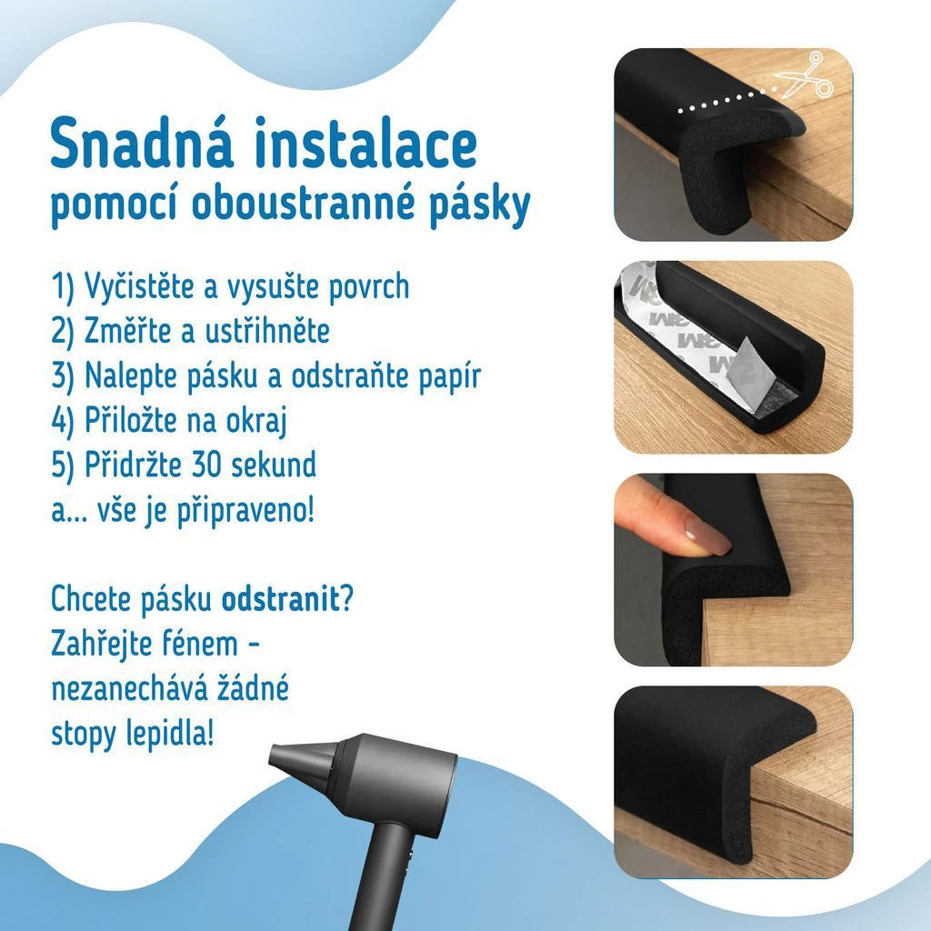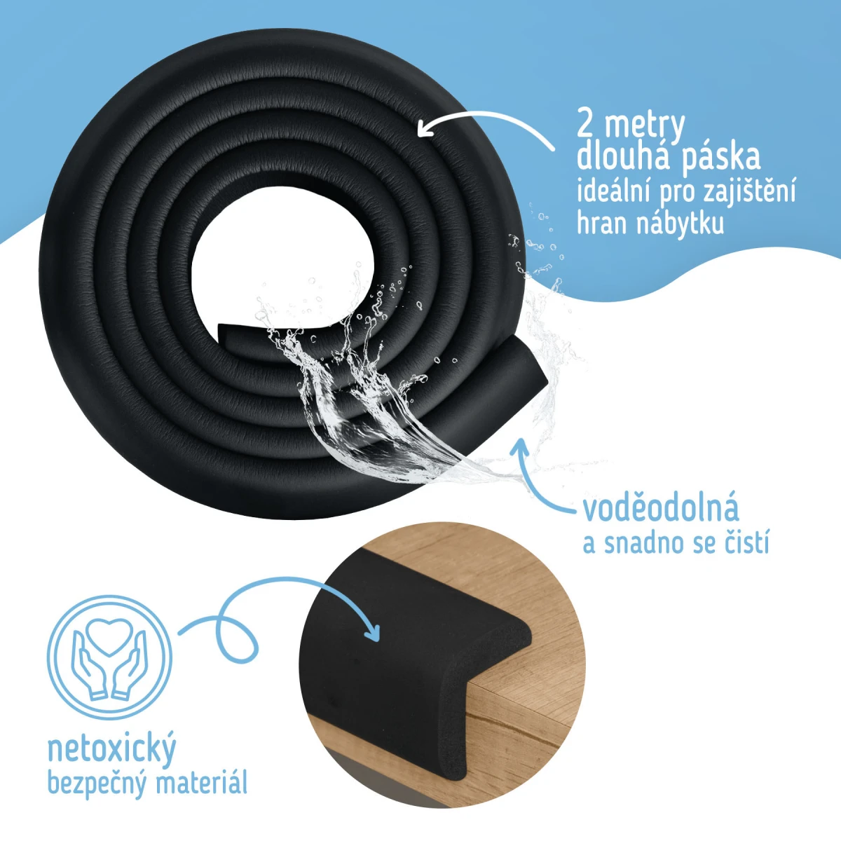 Ochranná páska je široce používaný bezpečnostní prvek díky materiálu a měkkosti. Lze ji použít k ochraně desek stolů, skříní, schodů a všech dalších prvků, které mají ostré hrany a mohly by tak představovat bezpečnostní riziko pro vaše děti.