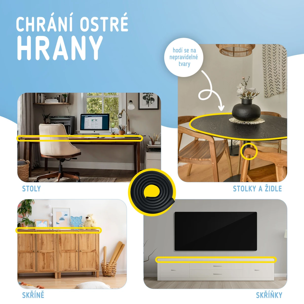 Ochrana ostrých hran a rohů je velmi užitečná bezpečnostní pomůcka zejména pro malé děti, které se učí chodit a běhat. Děti často omylem narazí do nábytku, což může mít za následek bolestivé modřiny nebo zranění. Ochranné pásky na hrany nábytku takovýmto zraněním zabraňují tím, že tlumí nárazy.
