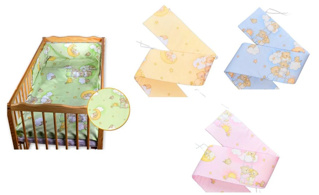 Mantinel má našité tkaničky, kterými je možno uchytit na postýlku