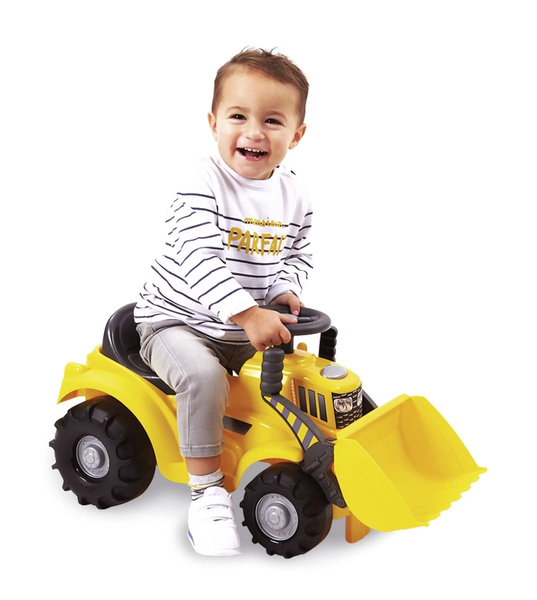 Odrážedlo má přední lžíci ovládanou pomocí dvou rukojetí, protiskluzový volant (bez funkce řízení), robustní plastová kola, úložný prostor pod sedadlem.