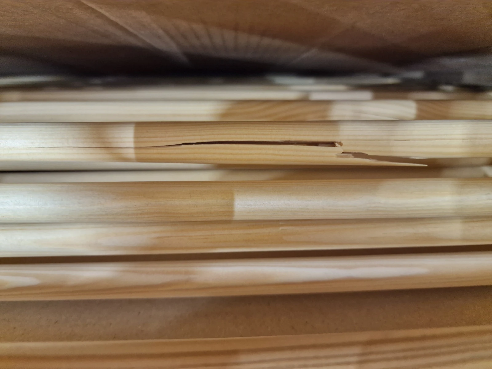 Ohrádka je nová, nepoužívaná, zařazená do 2. jakosti z důvodu poškození jedné šprušle. Ta je prasklá (viz fotografie), což může vytvářet ostré hrany a představovat riziko poranění dítěte. Před použitím je proto nutná oprava.