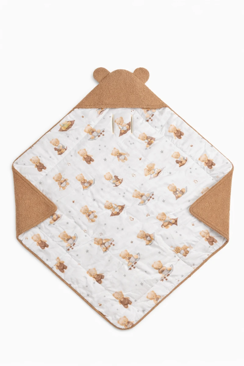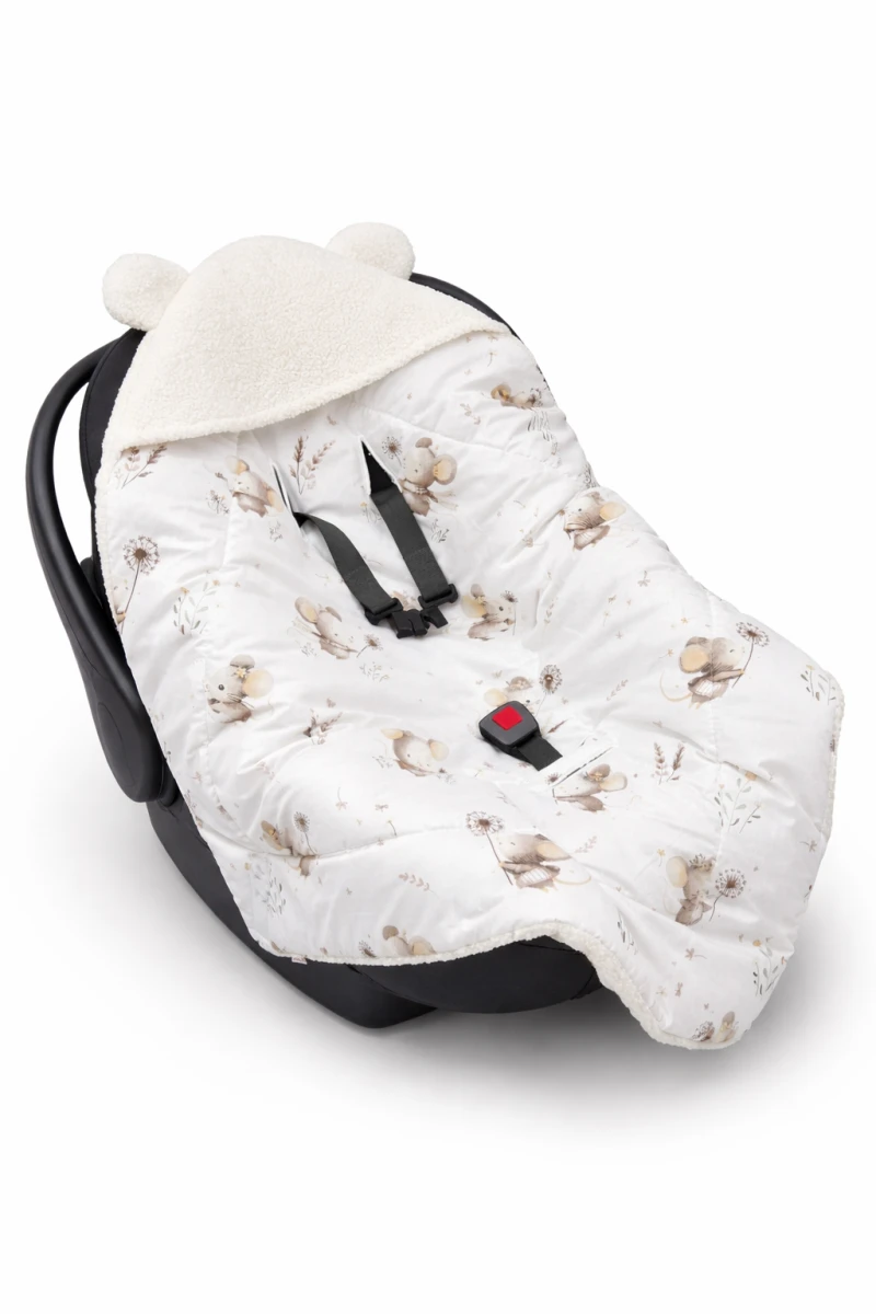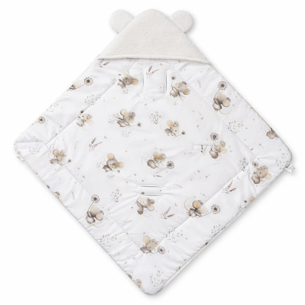 Měkoučká a praktická zavinovací deka 90×90 cm pro pohodlné a bezpečné cestování miminka. Díky 3 otvorům pro bezpečnostní pásy ji snadno použijete v autosedačce i kočárku. Lehká antialergická výplň udržuje teplo a současně dýchá, takže se děťátko nepřehřívá. Kapuce chrání hlavičku i citlivá ouška.