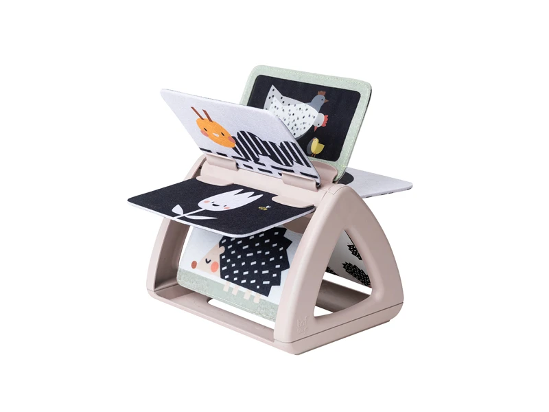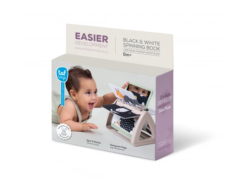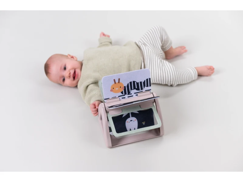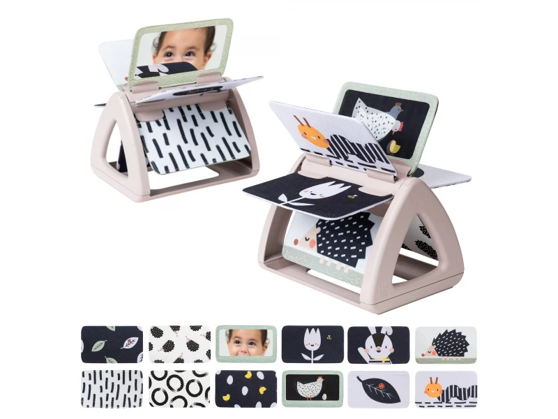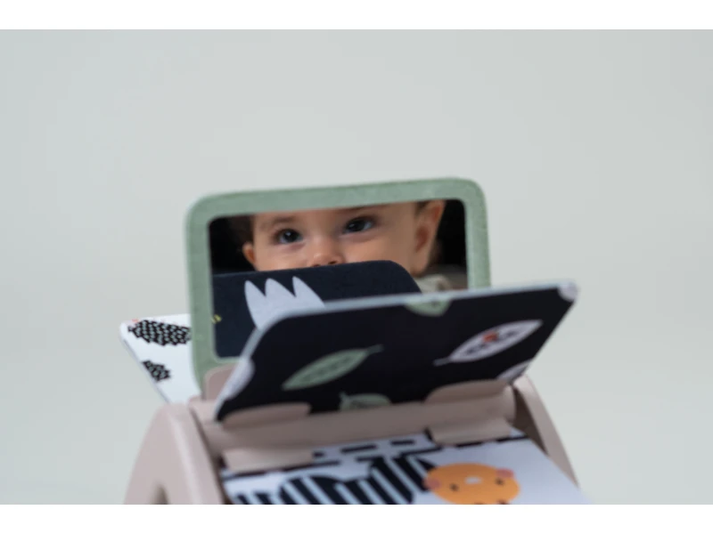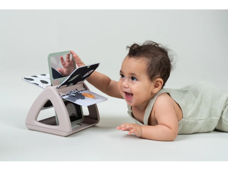 Od 2 měsíců: výrazné obrázky, bezpečné zrcátko, hologramový třpytivý obrázek a chrasticí zvuk při otáčení jednotlivých stránek upoutají pozornost dítěte při hře na bříšku