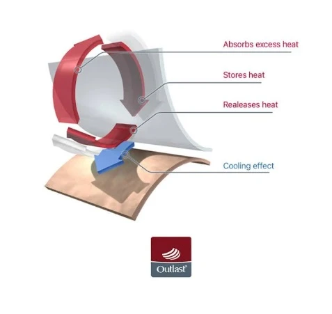 Materiál Outlast® dokáže pracovat s tělesným teplem, omezuje nadměrné pocení a v případě snížení teploty naopak zahřeje.
