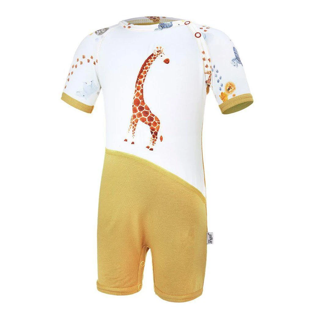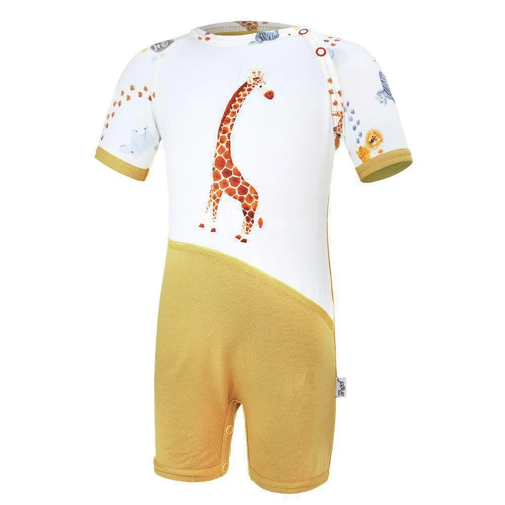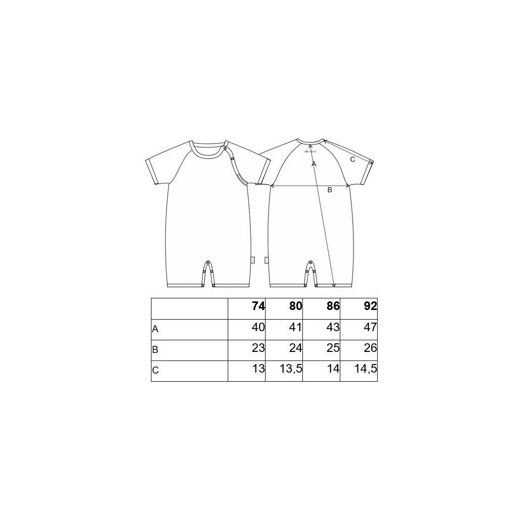 Díky pružnosti materiálu overal krásně přiléhá na tělíčko a nikde neodstává. Zapíná se na druky, které jsou umístněny na jedné straně u krčku a v rozkroku pro snadné přebalování. Overal je především určen do teplých letních dnů.