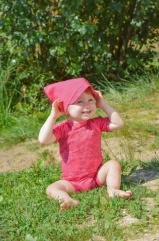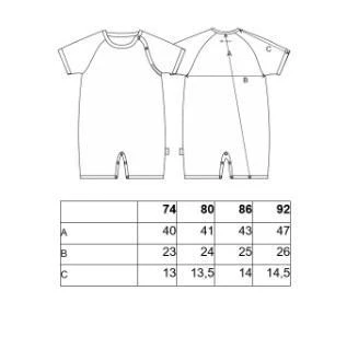 Díky pružnosti materiálu overal krásně přiléhá na tělíčko a nikde neodstává. Zapíná se na druky, které jsou umístněny na jedné straně u krčku a v rozkroku pro snadné přebalování.