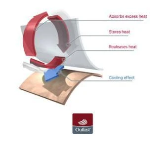 Tento materiál je díky svým termoregulačním schopnostem velmi příjemný při nošení. Při nadměrném zahřátí těla dokáže Outlast® nadbytečné teplo odvést a uložit. V okamžiku snížení teploty jej opět použije a zahřeje. Dítě tak má zajištěný teplotní komfort po celou dobu nošení.
