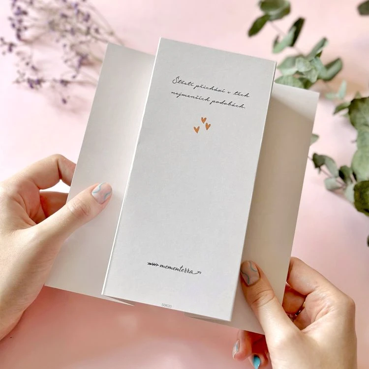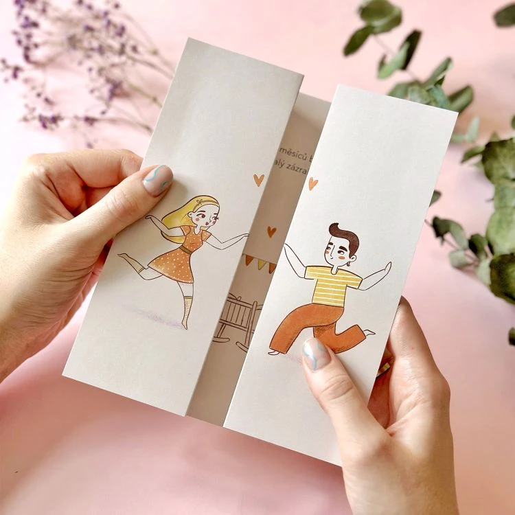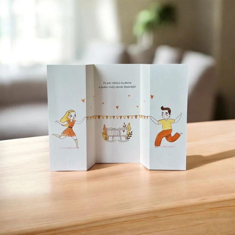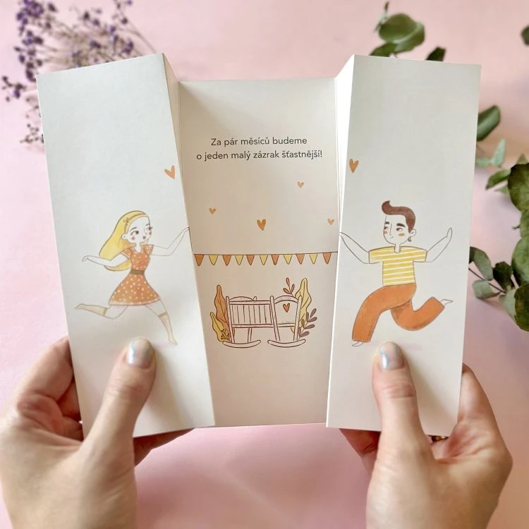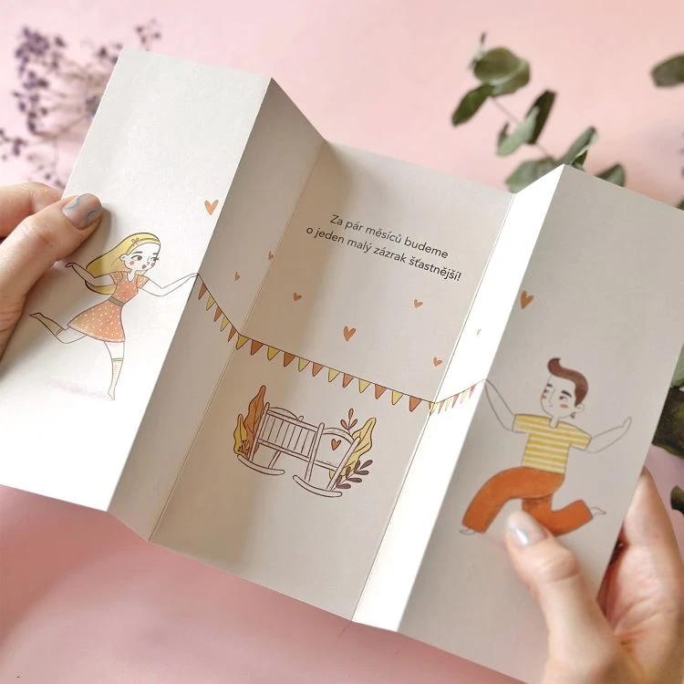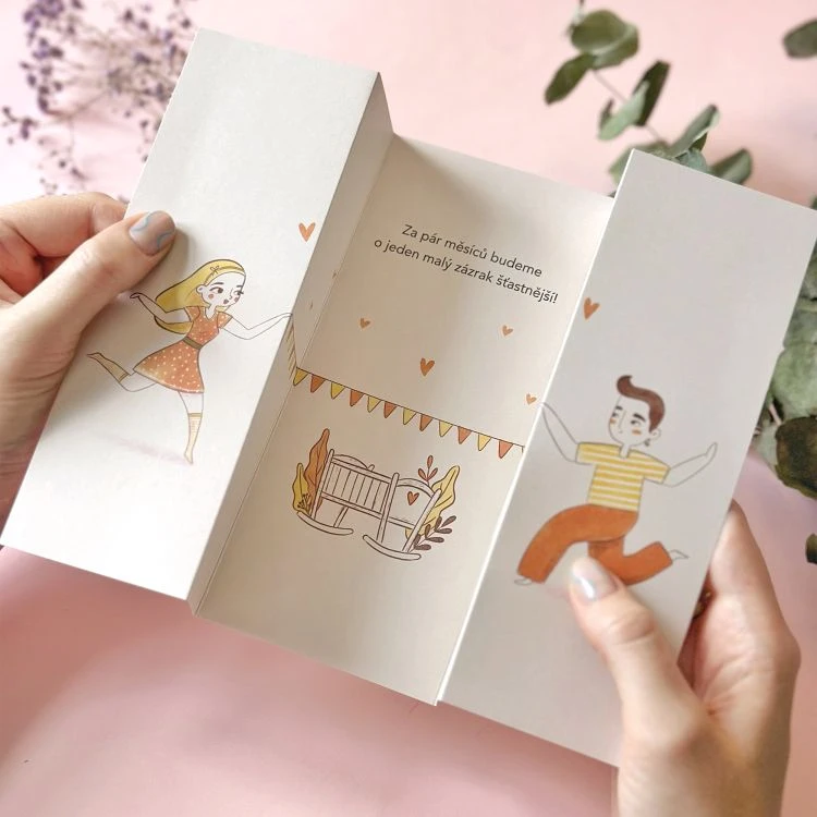 Text uvnitř: „Za pár měsíců budeme o jeden malý zázrak šťastnější!“