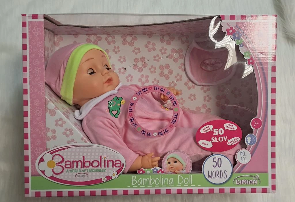 Krásné miminko Bambolina Sweet je o velikosti cca 46 cm, miminko ti poví 50 českých slov. Součástí balení jsou i doplňky.