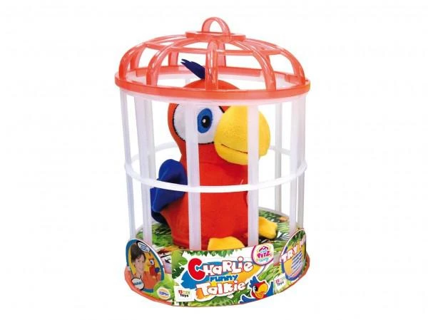 Veselý papoušek Charile se chová úplně jako živý. Když mu stisknete bříško, opakuje Charile všechno, co kolem sebe slyší. Navíc neulétne ani, když ho vyndáte z klece, protože má poutko, kterým si ho můžete připnout třeba k ruce.