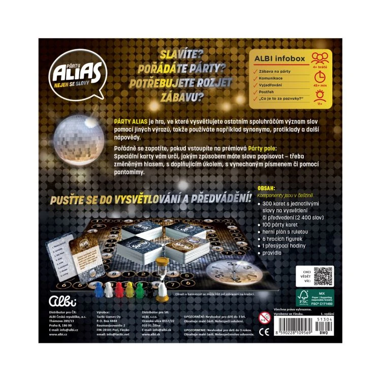 Hra nabízí 400 karet se slovy a osobnostmi (celkem 2400 slov a 700 postav), takže zábava jen tak nekončí. Díky nové české verzi s aktualizovanými úkoly a moderním vzhledem se Párty Alias stane středem každé společenské akce.