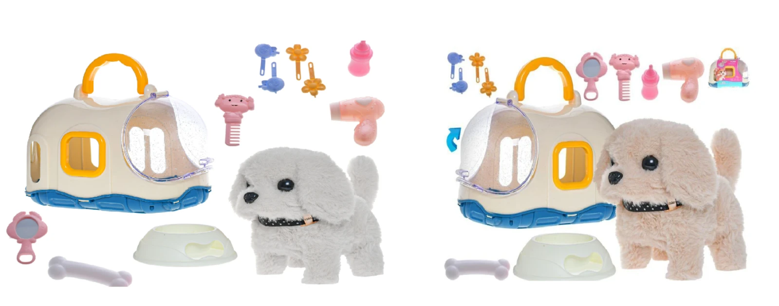 Pejsek plyšový 19 cm na baterie chodící a štěkající v přepravce