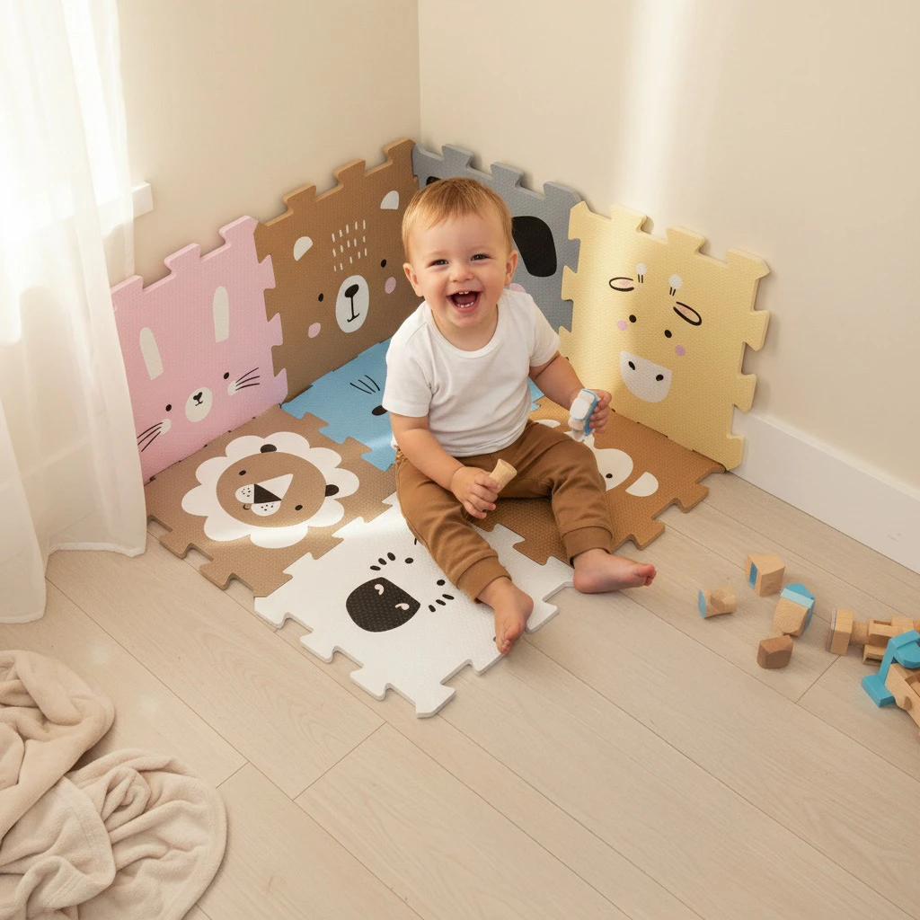 Pěnové puzzle je vyrobené z kvalitní EVA pěny. Plní funkci nejen podložky, která zajistí pohodlí díky izolaci od chladu, ale zároveň praktické pomůcky pro první měsíce miminka, kdy poskytuje měkkou oporu při pasení koníčku nebo prvním lezení.