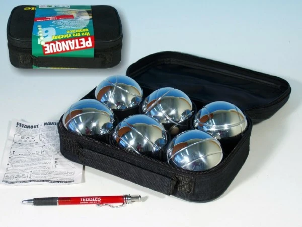 6 ocelových koulí s lesklým povrchem, rekreační sada pro 3 hráče (2 koule pro 1 hráče) v pouzdře.