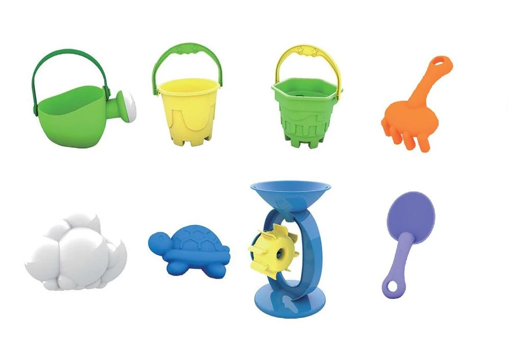 - Obsahuje 8 hraček (mlýn, formička, lopatka, hrabičky, obláček na vodu, 2 x kbelíky, krhlička)