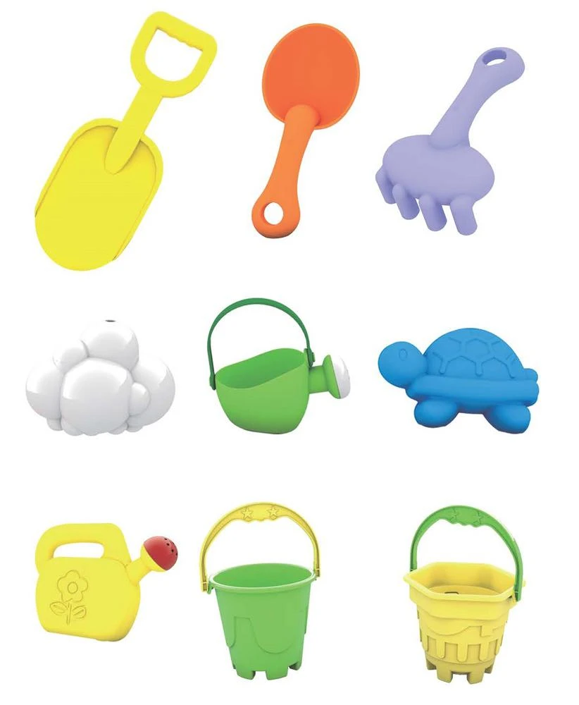 - Obsahuje 9 hraček (2 x krhlička, formička, 2 x lopatka, hrabičky, perforovaný obláček, 2 x kbelík)