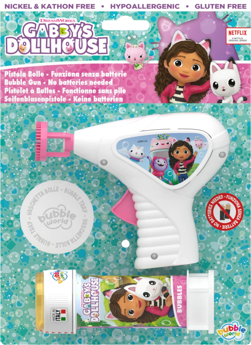 Zábavný bublifukový set s motivem Gabby's Dollhouse přinese dětem spoustu radosti a zábavy. Bublifuková pistole je skvělá pro hraní doma i venku, na oslavy, zahradní párty nebo jako milý dárek pro malé fanoušky Gábiny kouzelného domečku. Set nabízí jednoduché použití a promění každou hru v kouzelné dobrodružství plné bublin. Barevný design s oblíbeným motivem potěší děti a skvěle se hodí i jako doplněk na tematickou oslavu.