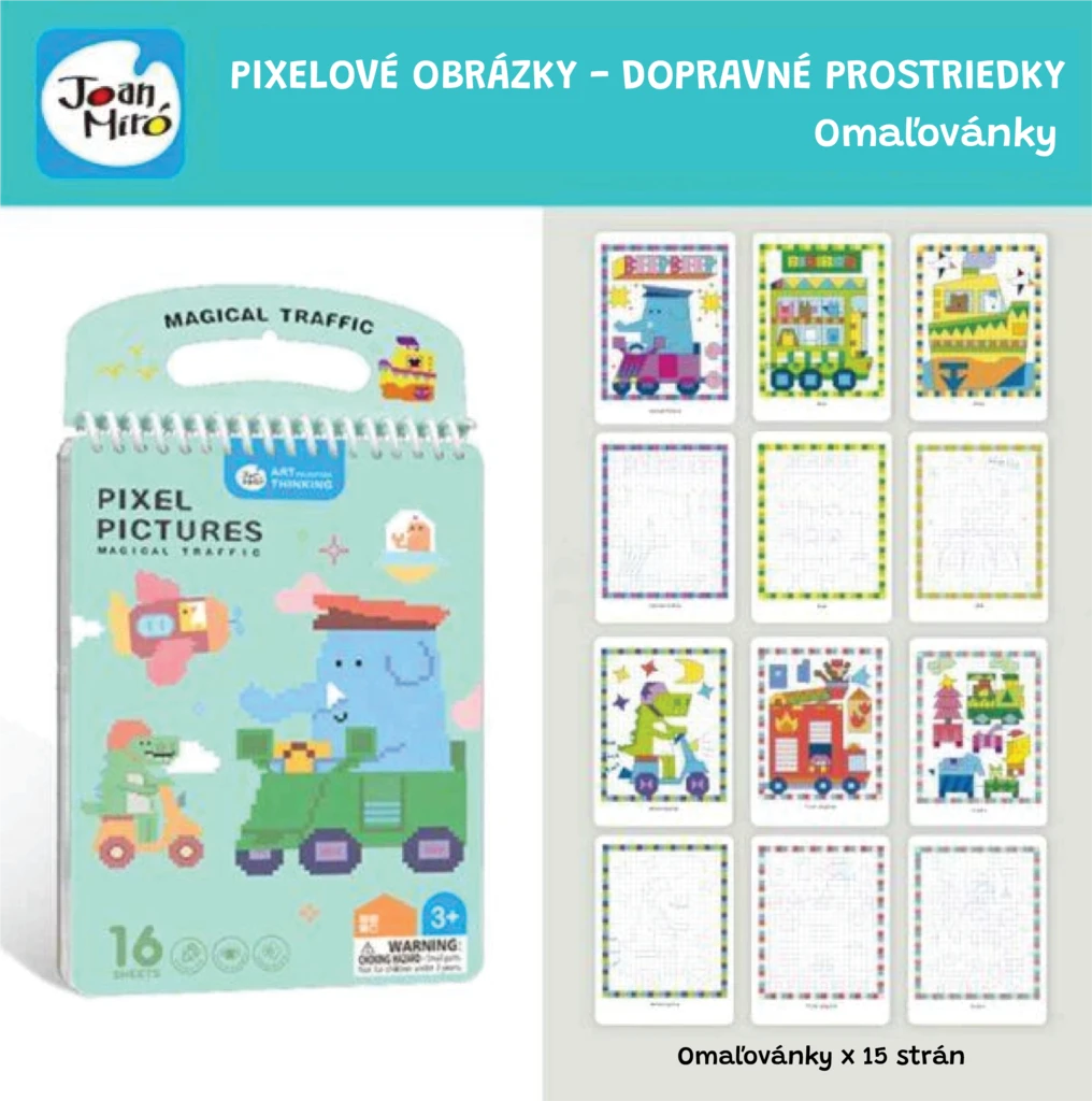 - 16 předtištěných stran s pixel art motivy dopravních prostředků