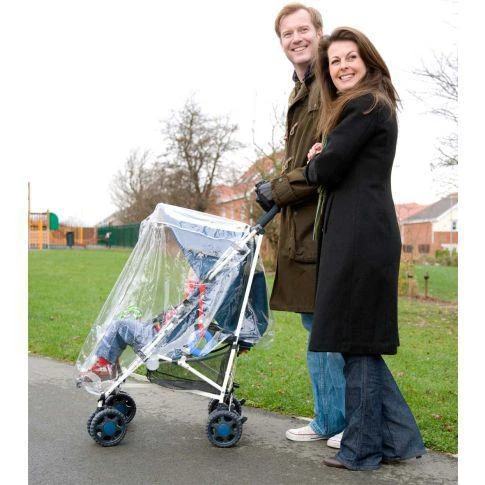 Univerzální, flexibilní, průhledná pláštěnka pro ochranu kočárku a částí korby před nepříznivým počasím.