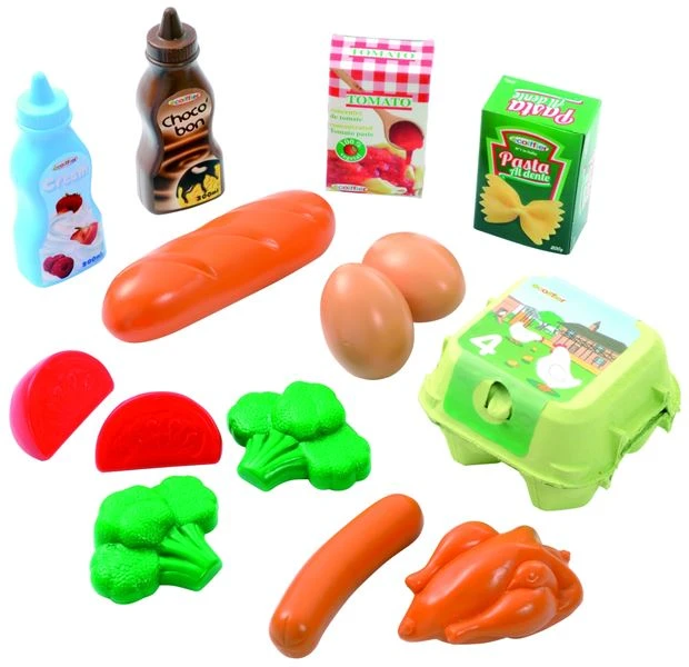 Makety potravin v síťce, např. vejce, kuře, bageta, zelenina,sirup atd.