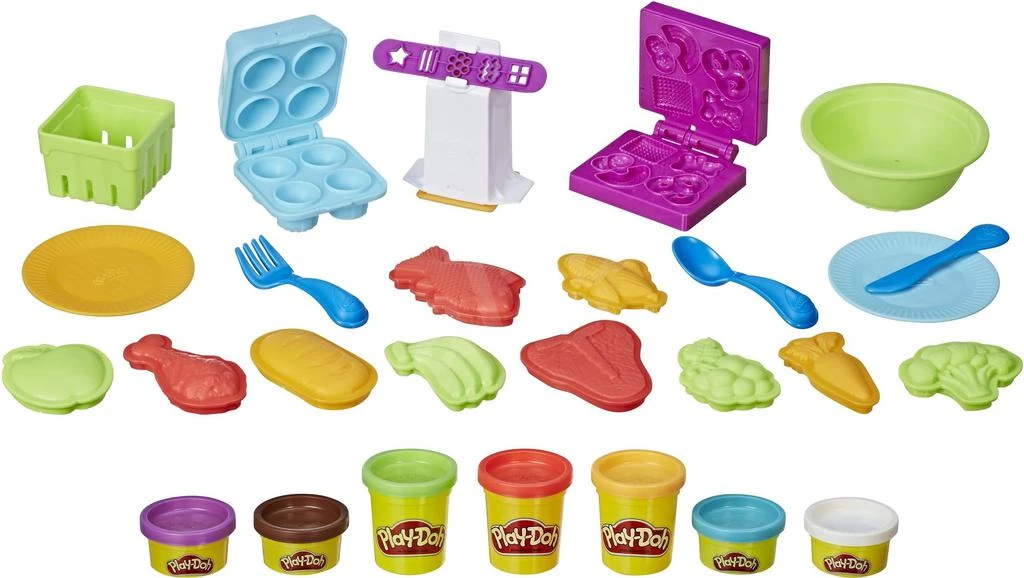 Tvoření jídla je úplná hračka s novou sadou na výrobu potravin. Až s dvaceti kusy vykrajovátek můžete vytvořit vše, co šéfkuchař k vaření potřebuje. Nákupní košík, talířky, příbory a k tomu formičky na ovoce, zeleninu i maso. V balení navíc 7 kelímků modelíny Play-Doh.