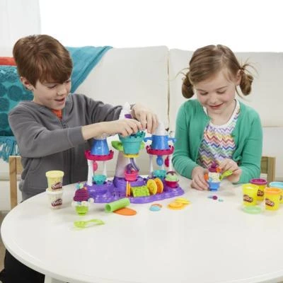 Splňte si své Play-Doh zmrzlinové sny v nejkouzelnějším fantastickém Zmrzlinovém paláci, jaký jste si kdy dokázali představit! Zmáčkněte bláznivé tvořítko na točenou zmrzlinu s vytlačovadlem, které má jednoduchou páku a unikátní mince na točenou zmrzlinu. Vložte různé mince a vytvořte různé tvary točené zmrzliny! Odendávací vyráběč posypky vám umožní zasypat vaše barevné výtvory polevou. Také obsahuje odendávací vytlačovací stroj na šlehačku a můžete tvarovat ještě potrhlejší polevy pomocí polovičních formiček na celé sestavě. Použijte obsaženou confetti hmotu na vytvoření ještě více postřiků pro zábavu! Herní sada obsahuje čtyři servírovací nádoby, ke každé je ladící lžička, dva zmrzlinové kornoutky, jednu servírovací lžičku, kužel na kornoutky, šest mincí na točenou zmrzlinu a 4 standardní kelímky modelovací hmoty Play-Doh a 2 standardní kelímky modelovací hmoty Play-Doh.