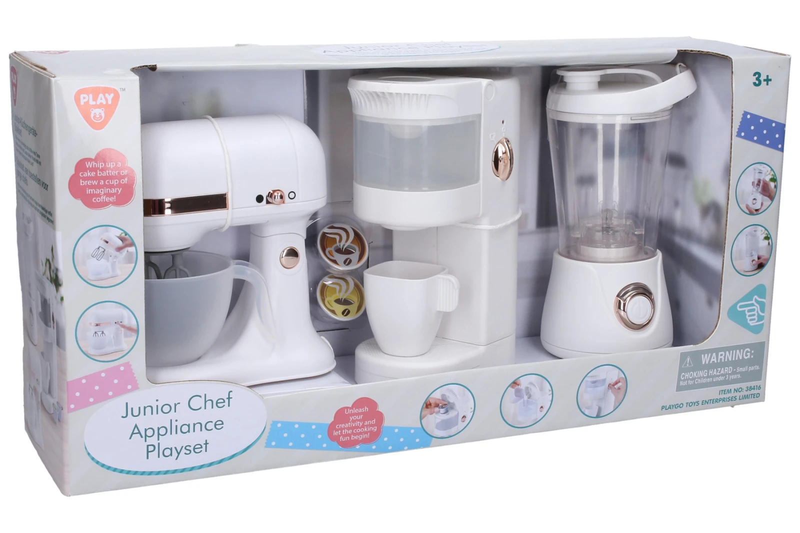 Obsahuje mixér 20 cm, kávovar 20 cm a kuchyňský robot 16 cm. 2xAA do kuchyňského robota a 2xAAA do mixéru, 2xAAA do kávovaru. Kávovar má nádržku na vodu, která protéká do hrnečku. mixér při podržení tlačítka mixuje, kuchyňský robot má přepínač na zapnutí a vypnutí šlehání.